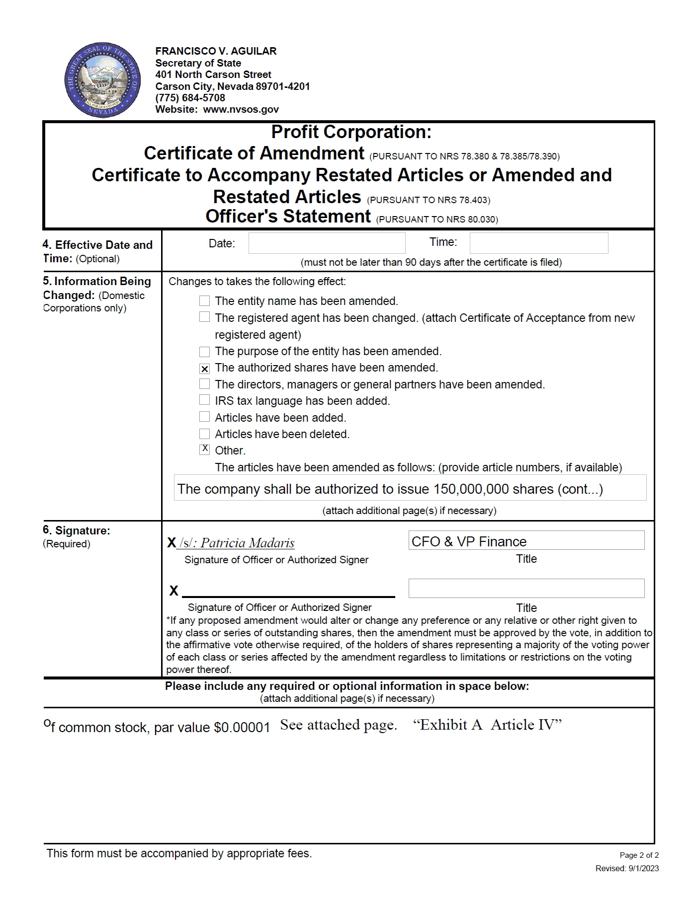 | ● | the filing of a Certificate of Amendment to the Company’s Articles of Incorporation to increase the Company’s authorized number of shares of Common Stock from 75,000,000 shares to 150,000,000 shares, including 149,500,000 shares of Common Stock, par value $0.00001 per share and 500,000 shares of Class A Common Stock, par value $0.00001 per share, and to restate Article IV, Section 4.01 thereof. |