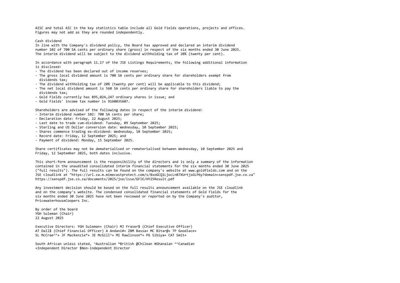 AISC and total AIC in the key statistics table include all Gold Fields operations, projects and offices. Figures may not add as they are rounded independently. Cash dividend In line with the Company's dividend policy, the Board has approved and declared an interim dividend number 102 of 700 SA cents per ordinary share (gross) in respect of the six months ended 30 June 2025. The interim dividend will be subject to the dividend withholding tax of 20% (twenty per cent). In accordance with paragraph 11.17 of the JSE Listings Requirements, the following additional information is disclosed: - The dividend has been declared out of income reserves; - The gross local dividend amount is 700 SA cents per ordinary share for shareholders exempt from dividends tax; - The dividend withholding tax of 20% (twenty per cent) will be applicable to this dividend; - The net local dividend amount is 560 SA cents per ordinary share for shareholders liable to pay the dividends tax; - Gold Fields currently has 895,024,247 ordinary shares in issue; and - Gold Fields' income tax number is 9160035607. Shareholders are advised of the following dates in respect of the interim dividend: - Interim dividend number 102: 700 SA cents per share; - Declaration date: Friday, 22 August 2025; - Last date to trade cum-dividend: Tuesday, 09 September 2025; - Sterling and US Dollar conversion date: Wednesday, 10 September 2025; - Shares commence trading ex-dividend: Wednesday, 10 September 2025; - Record date: Friday, 12 September 2025; and - Payment of dividend: Monday, 15 September 2025. Share certificates may not be dematerialised or rematerialised between Wednesday, 10 September 2025 and Friday, 12 September 2025, both dates inclusive. This short-form announcement is the responsibility of the directors and is only a summary of the information contained in the unaudited consolidated interim financial statements for the six months ended 30 June 2025 ("full results"). The full results can be found on the company's website at www.goldfields.com and on the JSE cloudlink at "https://url.za.m.mimecastprotect.com/s/8xoGCQ1LjocLnB7XUrtjsGLP6y?domain=senspdf.jse.co.za" https://senspdf.jse.co.za/documents/2025/jse/isse/GFIE/HY25Result.pdf Any investment decision should be based on the full results announcement available on the JSE cloudlink and on the company's website. The condensed consolidated financial statements of Gold Fields for the six months ended 30 June 2025 have not been reviewed or reported on by the Company's auditor, PricewaterhouseCoopers Inc. By order of the board YGH Suleman (Chair) 22 August 2025 Executive Directors: YGH Suleman+ (Chair) MJ Fraser$ (Chief Executive Officer) AT Dall$ (Chief Financial Officer) A Andani#+ ZBM Bassa+ MC Bitar@+ TP Goodlace+ SL McCrae^^+ JF MacKenzie*+ JE McGill^+ MI Rawlinson*+ PG Sibiya+ CAT Smit+ South African unless stated, ^Australian *British @Chilean #Ghanaian ^^Canadian +Independent Director $Non-independent Director
