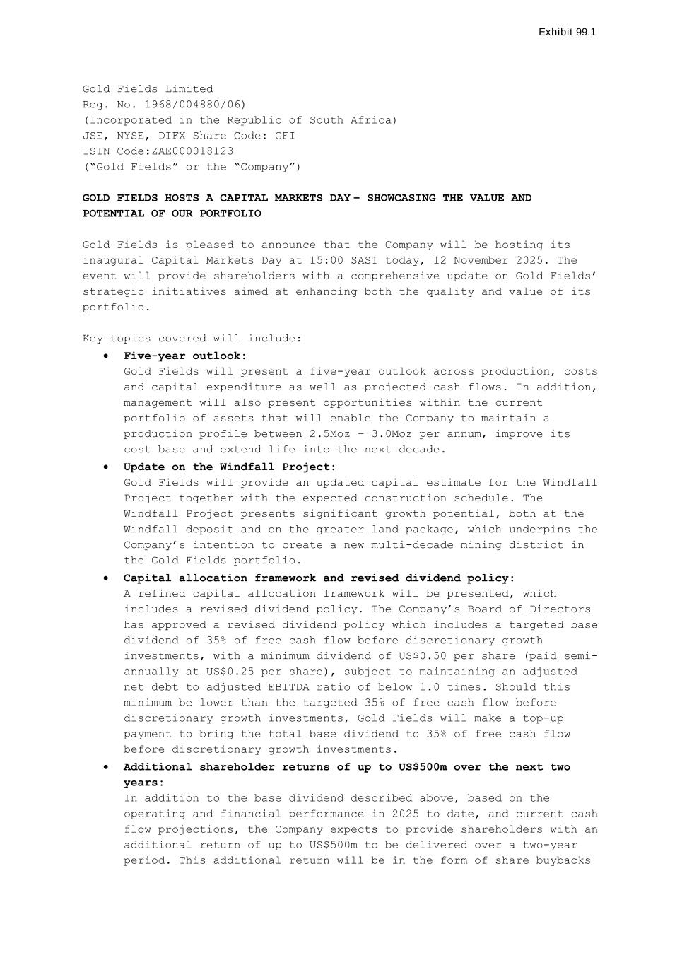 Gold Fields Limited Reg. No. 1968/004880/06) (Incorporated in the Republic of South Africa) JSE, NYSE, DIFX Share Code: GFI ISIN Code:ZAE000018123 (“Gold Fields” or the “Company”) GOLD FIELDS HOSTS A CAPITAL MARKETS DAY – SHOWCASING THE VALUE AND POTENTIAL OF OUR PORTFOLIO Gold Fields is pleased to announce that the Company will be hosting its inaugural Capital Markets Day at 15:00 SAST today, 12 November 2025. The event will provide shareholders with a comprehensive update on Gold Fields’ strategic initiatives aimed at enhancing both the quality and value of its portfolio. Key topics covered will include: • Five-year outlook: Gold Fields will present a five-year outlook across production, costs and capital expenditure as well as projected cash flows. In addition, management will also present opportunities within the current portfolio of assets that will enable the Company to maintain a production profile between 2.5Moz – 3.0Moz per annum, improve its cost base and extend life into the next decade. • Update on the Windfall Project: Gold Fields will provide an updated capital estimate for the Windfall Project together with the expected construction schedule. The Windfall Project presents significant growth potential, both at the Windfall deposit and on the greater land package, which underpins the Company’s intention to create a new multi-decade mining district in the Gold Fields portfolio. • Capital allocation framework and revised dividend policy: A refined capital allocation framework will be presented, which includes a revised dividend policy. The Company’s Board of Directors has approved a revised dividend policy which includes a targeted base dividend of 35% of free cash flow before discretionary growth investments, with a minimum dividend of US$0.50 per share (paid semi- annually at US$0.25 per share), subject to maintaining an adjusted net debt to adjusted EBITDA ratio of below 1.0 times. Should this minimum be lower than the targeted 35% of free cash flow before discretionary growth investments, Gold Fields will make a top-up payment to bring the total base dividend to 35% of free cash flow before discretionary growth investments. • Additional shareholder returns of up to US$500m over the next two years: In addition to the base dividend described above, based on the operating and financial performance in 2025 to date, and current cash flow projections, the Company expects to provide shareholders with an additional return of up to US$500m to be delivered over a two-year period. This additional return will be in the form of share buybacks