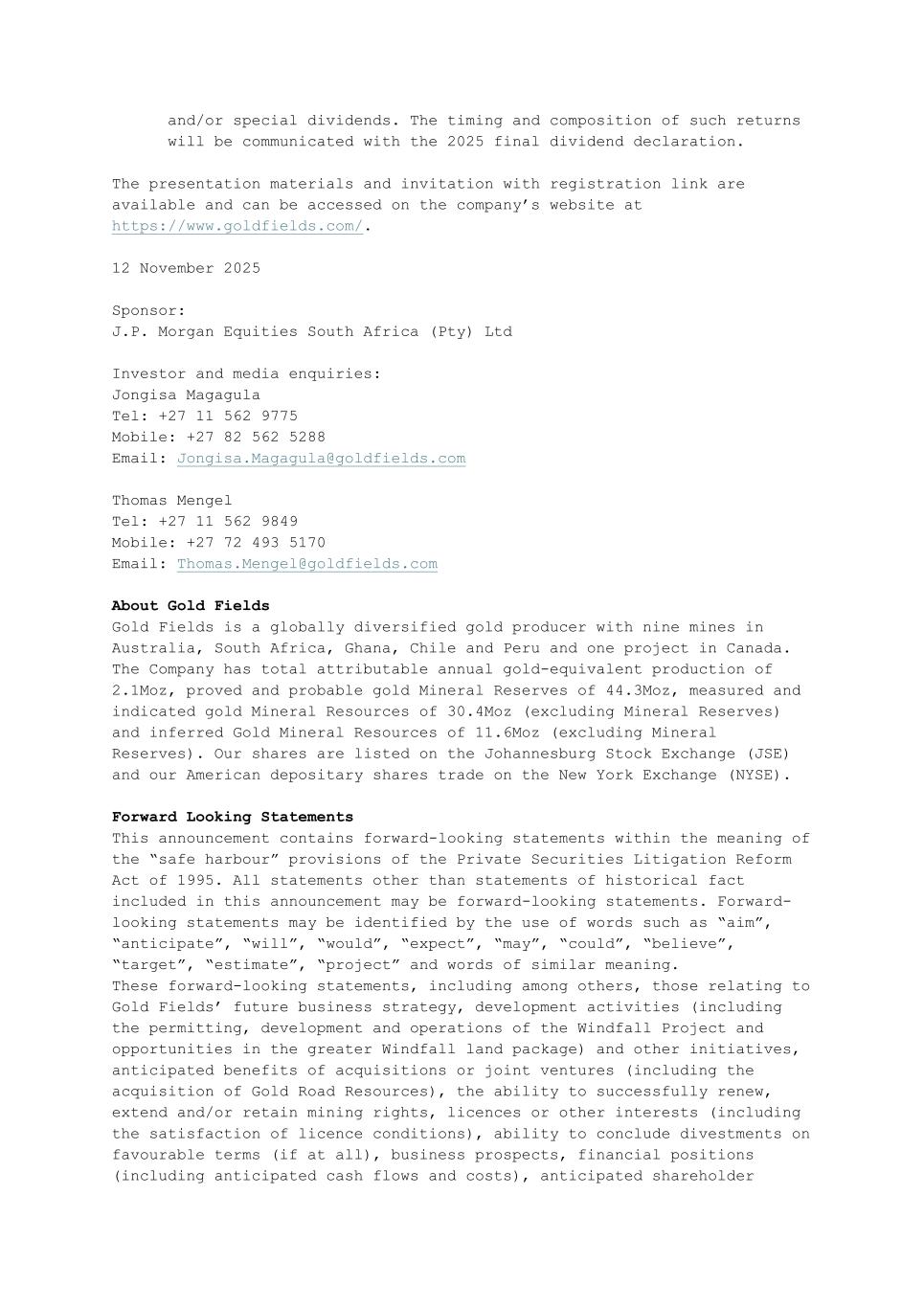 and/or special dividends. The timing and composition of such returns will be communicated with the 2025 final dividend declaration. The presentation materials and invitation with registration link are available and can be accessed on the company’s website at https://www.goldfields.com/. 12 November 2025 Sponsor: J.P. Morgan Equities South Africa (Pty) Ltd Investor and media enquiries: Jongisa Magagula Tel: +27 11 562 9775 Mobile: +27 82 562 5288 Email: Jongisa.Magagula@goldfields.com Thomas Mengel Tel: +27 11 562 9849 Mobile: +27 72 493 5170 Email: Thomas.Mengel@goldfields.com About Gold Fields Gold Fields is a globally diversified gold producer with nine mines in Australia, South Africa, Ghana, Chile and Peru and one project in Canada. The Company has total attributable annual gold-equivalent production of 2.1Moz, proved and probable gold Mineral Reserves of 44.3Moz, measured and indicated gold Mineral Resources of 30.4Moz (excluding Mineral Reserves) and inferred Gold Mineral Resources of 11.6Moz (excluding Mineral Reserves). Our shares are listed on the Johannesburg Stock Exchange (JSE) and our American depositary shares trade on the New York Exchange (NYSE). Forward Looking Statements This announcement contains forward-looking statements within the meaning of the “safe harbour” provisions of the Private Securities Litigation Reform Act of 1995. All statements other than statements of historical fact included in this announcement may be forward-looking statements. Forward- looking statements may be identified by the use of words such as “aim”, “anticipate”, “will”, “would”, “expect”, “may”, “could”, “believe”, “target”, “estimate”, “project” and words of similar meaning. These forward-looking statements, including among others, those relating to Gold Fields’ future business strategy, development activities (including the permitting, development and operations of the Windfall Project and opportunities in the greater Windfall land package) and other initiatives, anticipated benefits of acquisitions or joint ventures (including the acquisition of Gold Road Resources), the ability to successfully renew, extend and/or retain mining rights, licences or other interests (including the satisfaction of licence conditions), ability to conclude divestments on favourable terms (if at all), business prospects, financial positions (including anticipated cash flows and costs), anticipated shareholder