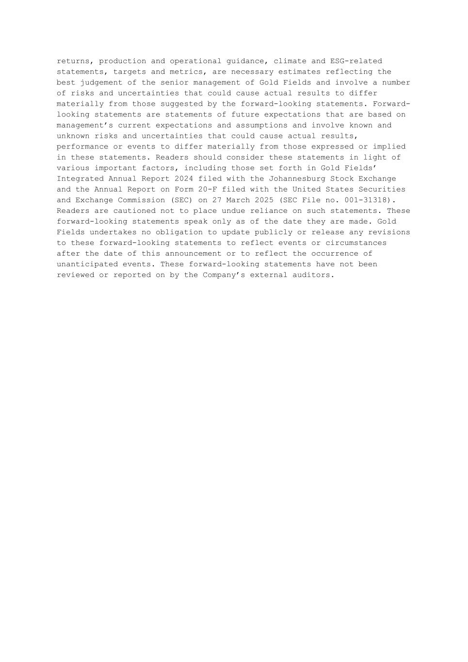 returns, production and operational guidance, climate and ESG-related statements, targets and metrics, are necessary estimates reflecting the best judgement of the senior management of Gold Fields and involve a number of risks and uncertainties that could cause actual results to differ materially from those suggested by the forward-looking statements. Forward- looking statements are statements of future expectations that are based on management’s current expectations and assumptions and involve known and unknown risks and uncertainties that could cause actual results, performance or events to differ materially from those expressed or implied in these statements. Readers should consider these statements in light of various important factors, including those set forth in Gold Fields’ Integrated Annual Report 2024 filed with the Johannesburg Stock Exchange and the Annual Report on Form 20-F filed with the United States Securities and Exchange Commission (SEC) on 27 March 2025 (SEC File no. 001-31318). Readers are cautioned not to place undue reliance on such statements. These forward-looking statements speak only as of the date they are made. Gold Fields undertakes no obligation to update publicly or release any revisions to these forward-looking statements to reflect events or circumstances after the date of this announcement or to reflect the occurrence of unanticipated events. These forward-looking statements have not been reviewed or reported on by the Company’s external auditors.