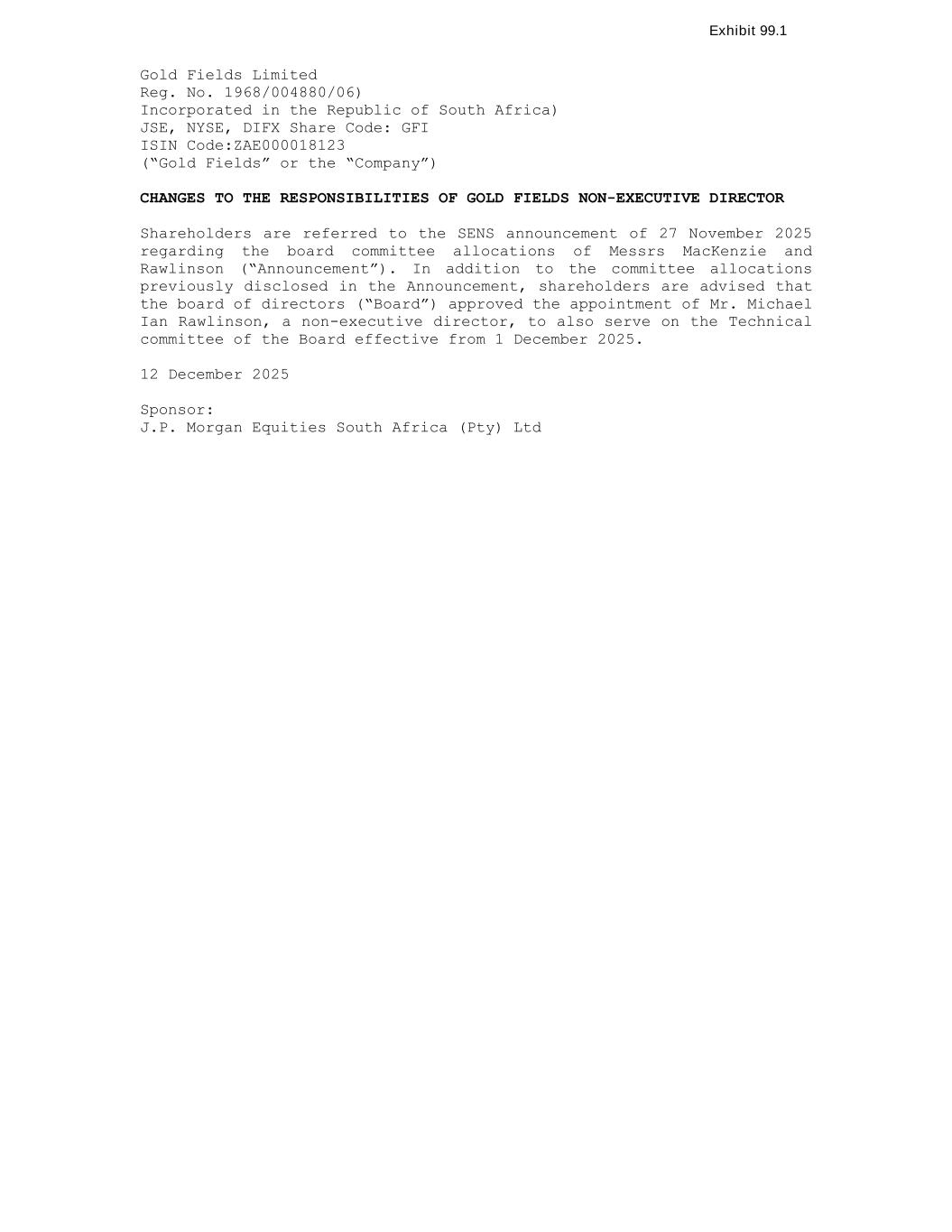 Gold Fields Limited Reg. No. 1968/004880/06) Incorporated in the Republic of South Africa) JSE, NYSE, DIFX Share Code: GFI ISIN Code:ZAE000018123 (“Gold Fields” or the “Company”) CHANGES TO THE RESPONSIBILITIES OF GOLD FIELDS NON-EXECUTIVE DIRECTOR Shareholders are referred to the SENS announcement of 27 November 2025 regarding the board committee allocations of Messrs MacKenzie and Rawlinson (“Announcement”). In addition to the committee allocations previously disclosed in the Announcement, shareholders are advised that the board of directors (“Board”) approved the appointment of Mr. Michael Ian Rawlinson, a non-executive director, to also serve on the Technical committee of the Board effective from 1 December 2025. 12 December 2025 Sponsor: J.P. Morgan Equities South Africa (Pty) Ltd