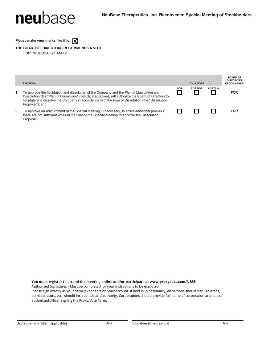 NeuBase Therapeutics, Inc. Reconvened Special Meeting of Stockholders Please make your marks like this: PROPOSAL YOUR VOTE BOARD OF DIRECTORS RECOMMENDS FOR AGAINST ABSTAIN 1. To approve the liquidation and dissolution of the Company and the Plan of Liquidation and Dissolution (the "Plan of Dissolution"), which, if approved, will authorize the Board of Directors to liquidate and dissolve the Company in accordance with the Plan of Dissolution (the "Dissolution Proposal"); and #P1# #P1# #P1# FOR 2. To approve an adjournment of the Special Meeting, if necessary, to solicit additional proxies if there are not sufficient votes at the time of the Special Meeting to approve the Dissolution Proposal. #P2# #P2# #P2# FOR Proposal_Page - VIFL You must register to attend the meeting online and/or participate at www.proxydocs.com/NBSE Authorized Signatures - Must be completed for your instructions to be executed. Please sign exactly as your name(s) appears on your account. If held in joint tenancy, all persons should sign. Trustees, administrators, etc., should include title and authority. Corporations should provide full name of corporation and title of authorized officer signing the Proxy/Vote Form. Signature (and Title if applicable) Date Signature (if held jointly) Date THE BOARD OF DIRECTORS RECOMMENDS A VOTE: FOR PROPOSALS 1 AND 2
