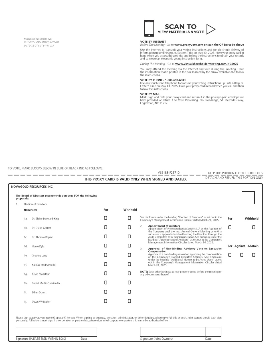 Signature [PLEASE SIGN WITHIN BOX] Date Signature (Joint Owners) Date TO VOTE, MARK BLOCKS BELOW IN BLUE OR BLACK INK AS FOLLOWS: KEEP THIS PORTION FOR YOUR RECORDS DETACH AND RETURN THIS PORTION ONLY THIS PROXY CARD IS VALID ONLY WHEN SIGNED AND DATED. V62188 - P25710 ! ! For Against Abstain ! ! ! ! ! Dr. Elaine Dorward - King 1a. ! ! Dr. Diane Garrett 1b. ! ! Dr. Thomas Kaplan 1c. ! ! Hume Kyle 1d. ! ! Gregory Lang 1e. ! ! Kalidas Madhavpeddi 1f. ! ! Kevin McArthur 1g. ! ! Daniel Muñiz Quintanilla 1h. ! ! Ethan Schutt 1i. ! ! Dawn Whittaker 1j. NOVAGOLD RESOURCES INC. 201 SOUTH MAIN STREET, SUITE 400 SALT LAKE CITY, UT 84111 USA VOTE BY INTERNET Before The Meeting - Go to www . proxyvote . com or scan the QR Barcode above Use the Internet to transmit your voting instructions and for electronic delivery of information up until 4 : 00 p . m . Eastern Time on May 13 , 2025 . Have your proxy card in hand when you access the web site and follow the instructions to obtain your records and to create an electronic voting instruction form . During The Meeting - Go to www . virtualshareholdermeeting . com/NG 2025 You may attend the meeting via the Internet and vote during the meeting . Have the information that is printed in the box marked by the arrow available and follow the instructions . VOTE BY PHONE - 1 - 800 - 690 - 6903 Use any touch - tone telephone to transmit your voting instructions up until 4 : 00 p . m . Eastern Time on May 13 , 2025 . Have your proxy card in hand when you call and then follow the instructions . VOTE BY MAIL Mark, sign and date your proxy card and return it in the postage - paid envelope we have provided or return it to Vote Processing, c/o Broadridge, 51 Mercedes Way, Edgewood, NY 11717 . 1. 2. Appointment of Auditors Appointment of PricewaterhouseCoopers LLP as the Auditors of the Company until the next Annual General Meeting or until a successor is appointed and authorizing the Directors through the Audit Committee to fix their remuneration . See disclosure under the heading “Appointment of Auditors” as set out in the Company’s Management Information Circular dated March 24 , 2025 . 3. Approval of Non - Binding Advisory Vote on Executive Compensation Approval of a non - binding resolution approving the compensation of the Company’s Named Executive Officers . See disclosure under the heading “Additional Matters to be Acted Upon” as set out in the Company’s Management Information Circular dated March 24 , 2025 . Election of Directors Nominees: See disclosure under the heading "Election of Directors" as set out in the Company’s Management Information Circular dated March 24, 2025. Please sign exactly as your name(s) appear(s) hereon. When signing as attorney, executor, administrator, or other fiduciary, please give full title as such. Joint owners should each sign personally. All holders must sign. If a corporation or partnership, please sign in full corporate or partnership name by authorized officer. NOTE: Such other business as may properly come before the meeting or any adjournment thereof. NOVAGOLD RESOURCES INC. The Board of Directors recommends you vote FOR the following proposals: For Withhold For Withhold SCAN TO VIEW MATERIALS & VOTE