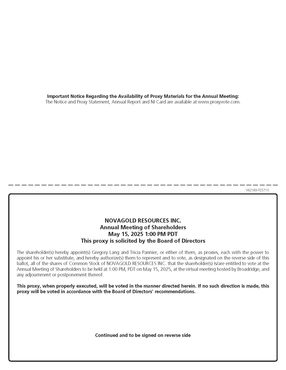 V62189 - P25710 Important Notice Regarding the Availability of Proxy Materials for the Annual Meeting: The Notice and Proxy Statement, Annual Report and NI Card are available at www.proxyvote.com. NOVAGOLD RESOURCES INC. Annual Meeting of Shareholders May 15, 2025 1:00 PM PDT This proxy is solicited by the Board of Directors The shareholder(s) hereby appoint(s) Gregory Lang and Tricia Pannier, or either of them, as proxies, each with the power to appoint his or her substitute, and hereby authorize(s) them to represent and to vote, as designated on the reverse side of this ballot, all of the shares of Common Stock of NOVAGOLD RESOURCES INC . that the shareholder(s) is/are entitled to vote at the Annual Meeting of Shareholders to be held at 1 : 00 PM, PDT on May 15 , 2025 , at the virtual meeting hosted by Broadridge, and any adjournment or postponement thereof . This proxy, when properly executed, will be voted in the manner directed herein . If no such direction is made, this proxy will be voted in accordance with the Board of Directors' recommendations . Continued and to be signed on reverse side