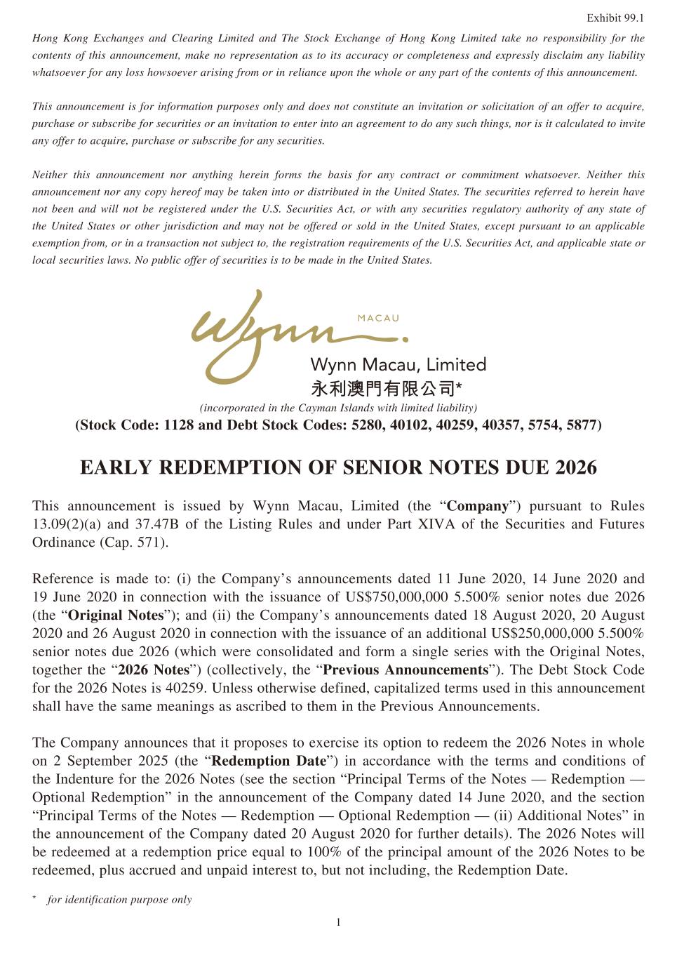 1 Hong Kong Exchanges and Clearing Limited and The Stock Exchange of Hong Kong Limited take no responsibility for the contents of this announcement, make no representation as to its accuracy or completeness and expressly disclaim any liability whatsoever for any loss howsoever arising from or in reliance upon the whole or any part of the contents of this announcement. This announcement is for information purposes only and does not constitute an invitation or solicitation of an offer to acquire, purchase or subscribe for securities or an invitation to enter into an agreement to do any such things, nor is it calculated to invite any offer to acquire, purchase or subscribe for any securities. Neither this announcement nor anything herein forms the basis for any contract or commitment whatsoever. Neither this announcement nor any copy hereof may be taken into or distributed in the United States. The securities referred to herein have not been and will not be registered under the U.S. Securities Act, or with any securities regulatory authority of any state of the United States or other jurisdiction and may not be offered or sold in the United States, except pursuant to an applicable exemption from, or in a transaction not subject to, the registration requirements of the U.S. Securities Act, and applicable state or local securities laws. No public offer of securities is to be made in the United States. (incorporated in the Cayman Islands with limited liability) (Stock Code: 1128 and Debt Stock Codes: 5280, 40102, 40259, 40357, 5754, 5877) EARLY REDEMPTION OF SENIOR NOTES DUE 2026 This announcement is issued by Wynn Macau, Limited (the “Company”) pursuant to Rules 13.09(2)(a) and 37.47B of the Listing Rules and under Part XIVA of the Securities and Futures Ordinance (Cap. 571). Reference is made to: (i) the Company’s announcements dated 11 June 2020, 14 June 2020 and 19 June 2020 in connection with the issuance of US$750,000,000 5.500% senior notes due 2026 (the “Original Notes”); and (ii) the Company’s announcements dated 18 August 2020, 20 August 2020 and 26 August 2020 in connection with the issuance of an additional US$250,000,000 5.500% senior notes due 2026 (which were consolidated and form a single series with the Original Notes, together the “2026 Notes”) (collectively, the “Previous Announcements”). The Debt Stock Code for the 2026 Notes is 40259. Unless otherwise defined, capitalized terms used in this announcement shall have the same meanings as ascribed to them in the Previous Announcements. The Company announces that it proposes to exercise its option to redeem the 2026 Notes in whole on 2 September 2025 (the “Redemption Date”) in accordance with the terms and conditions of the Indenture for the 2026 Notes (see the section “Principal Terms of the Notes — Redemption — Optional Redemption” in the announcement of the Company dated 14 June 2020, and the section “Principal Terms of the Notes — Redemption — Optional Redemption — (ii) Additional Notes” in the announcement of the Company dated 20 August 2020 for further details). The 2026 Notes will be redeemed at a redemption price equal to 100% of the principal amount of the 2026 Notes to be redeemed, plus accrued and unpaid interest to, but not including, the Redemption Date. * for identification purpose only