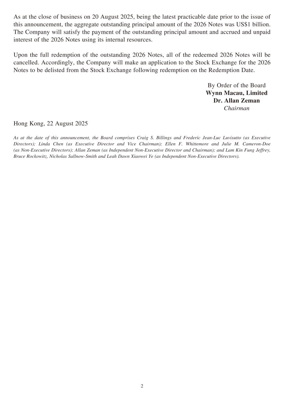 2 As at the close of business on 20 August 2025, being the latest practicable date prior to the issue of this announcement, the aggregate outstanding principal amount of the 2026 Notes was US$1 billion. The Company will satisfy the payment of the outstanding principal amount and accrued and unpaid interest of the 2026 Notes using its internal resources. Upon the full redemption of the outstanding 2026 Notes, all of the redeemed 2026 Notes will be cancelled. Accordingly, the Company will make an application to the Stock Exchange for the 2026 Notes to be delisted from the Stock Exchange following redemption on the Redemption Date. By Order of the Board Wynn Macau, Limited Dr. Allan Zeman Chairman Hong Kong, 22 August 2025 As at the date of this announcement, the Board comprises Craig S. Billings and Frederic Jean-Luc Luvisutto (as Executive Directors); Linda Chen (as Executive Director and Vice Chairman); Ellen F. Whittemore and Julie M. Cameron-Doe (as Non-Executive Directors); Allan Zeman (as Independent Non-Executive Director and Chairman); and Lam Kin Fung Jeffrey, Bruce Rockowitz, Nicholas Sallnow-Smith and Leah Dawn Xiaowei Ye (as Independent Non-Executive Directors).