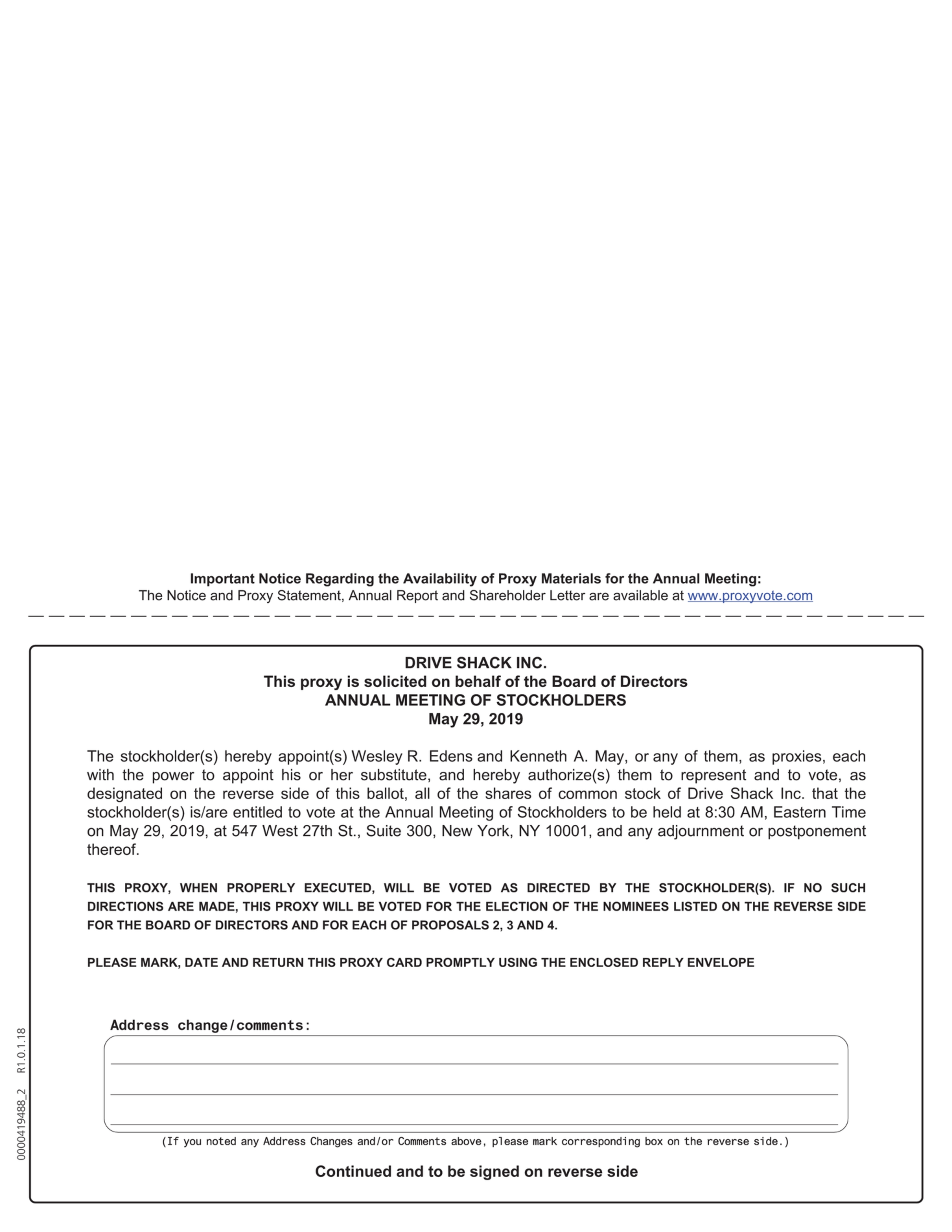 FOR THE STOCKHOLDER MEETING TO BE HELD ON MAY 29, 2019: The Notice of Annual Meeting, Proxy Statement and the Annual Report on Form 10-K are available on the Investor Relations section of our website at http://ir.driveshack.com. |