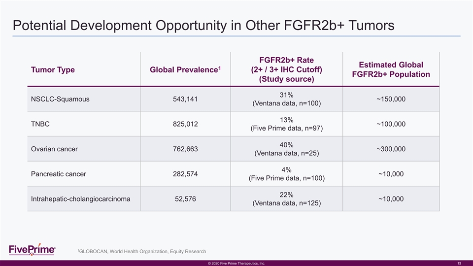 Potential Development Opportunity in Other FGFR2b+ Tumors FGFR2b+ Rate Estimated Global 1 Tumor Type Global Prevalence (2+ / 3+ IHC Cutoff) FGFR2b+ Population (Study source) 31% NSCLC-Squamous 543,141 ~150,000 (Ventana data, n=100) 13% TNBC 825,012 ~100,000 (Five Prime data, n=97) 40% Ovarian cancer 762,663 ~300,000 (Ventana data, n=25) 4% Pancreatic cancer 282,574 ~10,000 (Five Prime data, n=100) 22% Intrahepatic-cholangiocarcinoma 52,576 ~10,000 (Ventana data, n=125) 1 GLOBOCAN, World Health Organization, Equity Research © © 2 202 020 0 F Fiiv ve e P Pr riim me e T The her ra ape peu ut tiic cs s, , I In nc c. . 13Potential Development Opportunity in Other FGFR2b+ Tumors FGFR2b+ Rate Estimated Global 1 Tumor Type Global Prevalence (2+ / 3+ IHC Cutoff) FGFR2b+ Population (Study source) 31% NSCLC-Squamous 543,141 ~150,000 (Ventana data, n=100) 13% TNBC 825,012 ~100,000 (Five Prime data, n=97) 40% Ovarian cancer 762,663 ~300,000 (Ventana data, n=25) 4% Pancreatic cancer 282,574 ~10,000 (Five Prime data, n=100) 22% Intrahepatic-cholangiocarcinoma 52,576 ~10,000 (Ventana data, n=125) 1 GLOBOCAN, World Health Organization, Equity Research © © 2 202 020 0 F Fiiv ve e P Pr riim me e T The her ra ape peu ut tiic cs s, , I In nc c. . 13