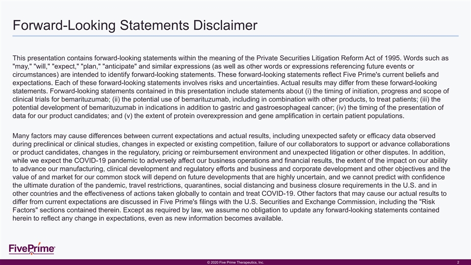 .2 Bemarituzumab Targeted Therapy for FGFR2b+ Tumors November 10, 2020 © 2020 Five Prime Therapeutics, Inc..2 Bemarituzumab Targeted Therapy for FGFR2b+ Tumors November 10, 2020 © 2020 Five Prime Therapeutics, Inc.