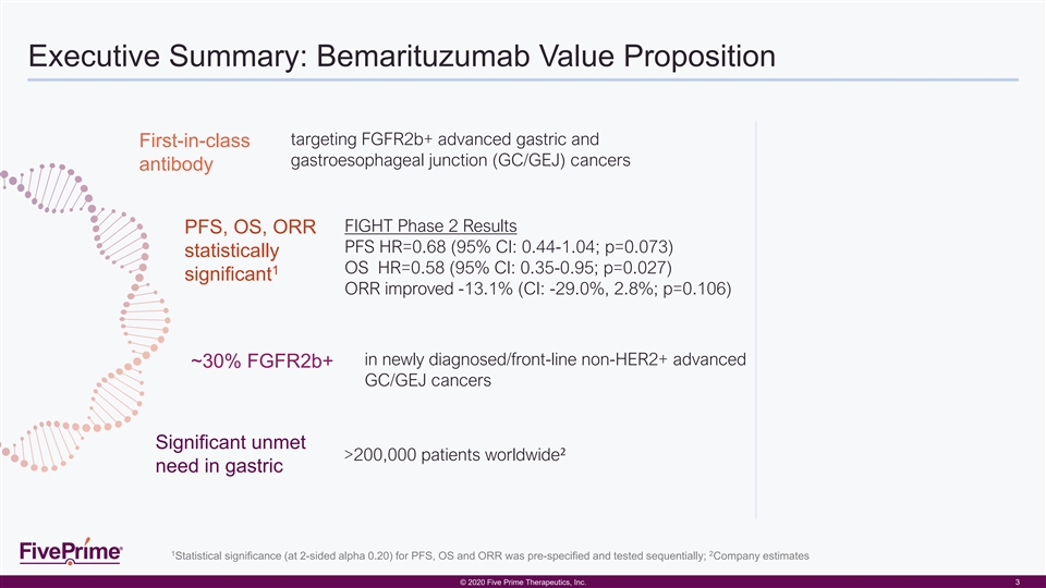 Forward-Looking Statements Disclaimer This presentation contains forward-looking statements within the meaning of the Private Securities Litigation Reform Act of 1995. Words such as may, will, expect, plan, anticipate and similar expressions (as well as other words or expressions referencing future events or circumstances) are intended to identify forward-looking statements. These forward-looking statements reflect Five Prime's current beliefs and expectations. Each of these forward-looking statements involves risks and uncertainties. Actual results may differ from these forward-looking statements. Forward-looking statements contained in this presentation include statements about (i) the timing of initiation, progress and scope of clinical trials for bemarituzumab; (ii) the potential use of bemarituzumab, including in combination with other products, to treat patients; (iii) the potential development of bemarituzumab in indications in addition to gastric and gastroesophageal cancer; (iv) the timing of the presentation of data for our product candidates; and (v) the extent of protein overexpression and gene amplification in certain patient populations. Many factors may cause differences between current expectations and actual results, including unexpected safety or efficacy data observed during preclinical or clinical studies, changes in expected or existing competition, failure of our collaborators to support or advance collaborations or product candidates, changes in the regulatory, pricing or reimbursement environment and unexpected litigation or other disputes. In addition, while we expect the COVID-19 pandemic to adversely affect our business operations and financial results, the extent of the impact on our ability to advance our manufacturing, clinical development and regulatory efforts and business and corporate development and other objectives and the value of and market for our common stock will depend on future developments that are highly uncertain, and we cannot predict with confidence the ultimate duration of the pandemic, travel restrictions, quarantines, social distancing and business closure requirements in the U.S. and in other countries and the effectiveness of actions taken globally to contain and treat COVID-19. Other factors that may cause our actual results to differ from current expectations are discussed in Five Prime's filings with the U.S. Securities and Exchange Commission, including the Risk Factors sections contained therein. Except as required by law, we assume no obligation to update any forward-looking statements contained herein to reflect any change in expectations, even as new information becomes available. © © 2 202 020 0 F Fiiv ve e P Pr riim me e T The her ra ape peu ut tiic cs s, , I In nc c. . 2Forward-Looking Statements Disclaimer This presentation contains forward-looking statements within the meaning of the Private Securities Litigation Reform Act of 1995. Words such as may, will, expect, plan, anticipate and similar expressions (as well as other words or expressions referencing future events or circumstances) are intended to identify forward-looking statements. These forward-looking statements reflect Five Prime's current beliefs and expectations. Each of these forward-looking statements involves risks and uncertainties. Actual results may differ from these forward-looking statements. Forward-looking statements contained in this presentation include statements about (i) the timing of initiation, progress and scope of clinical trials for bemarituzumab; (ii) the potential use of bemarituzumab, including in combination with other products, to treat patients; (iii) the potential development of bemarituzumab in indications in addition to gastric and gastroesophageal cancer; (iv) the timing of the presentation of data for our product candidates; and (v) the extent of protein overexpression and gene amplification in certain patient populations. Many factors may cause differences between current expectations and actual results, including unexpected safety or efficacy data observed during preclinical or clinical studies, changes in expected or existing competition, failure of our collaborators to support or advance collaborations or product candidates, changes in the regulatory, pricing or reimbursement environment and unexpected litigation or other disputes. In addition, while we expect the COVID-19 pandemic to adversely affect our business operations and financial results, the extent of the impact on our ability to advance our manufacturing, clinical development and regulatory efforts and business and corporate development and other objectives and the value of and market for our common stock will depend on future developments that are highly uncertain, and we cannot predict with confidence the ultimate duration of the pandemic, travel restrictions, quarantines, social distancing and business closure requirements in the U.S. and in other countries and the effectiveness of actions taken globally to contain and treat COVID-19. Other factors that may cause our actual results to differ from current expectations are discussed in Five Prime's filings with the U.S. Securities and Exchange Commission, including the Risk Factors sections contained therein. Except as required by law, we assume no obligation to update any forward-looking statements contained herein to reflect any change in expectations, even as new information becomes available. © © 2 202 020 0 F Fiiv ve e P Pr riim me e T The her ra ape peu ut tiic cs s, , I In nc c. . 2