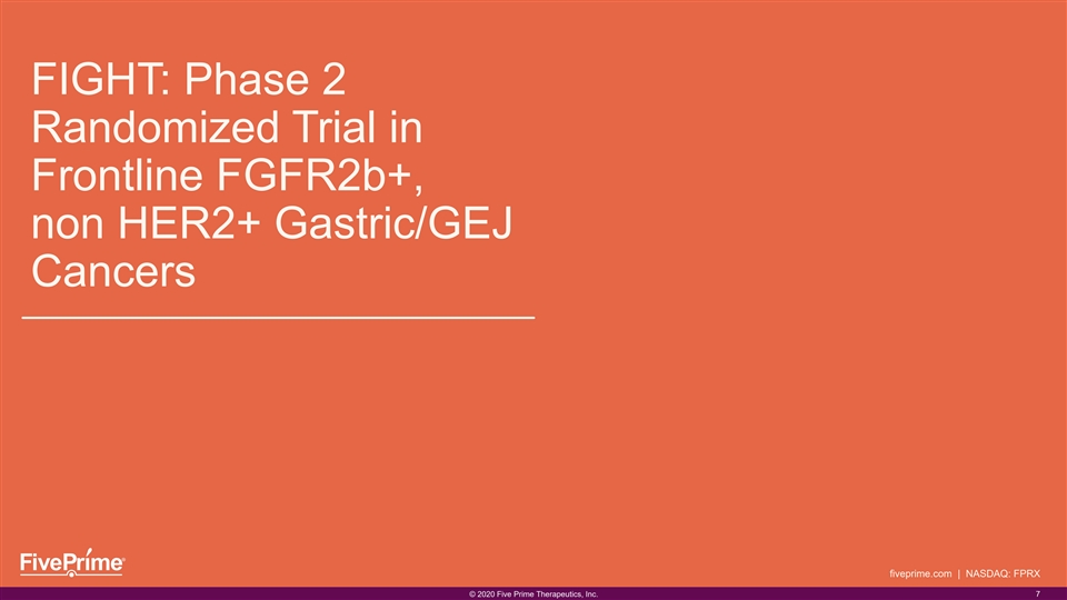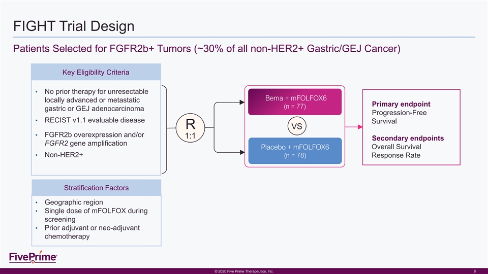 FIGHT: Phase 2 Randomized Trial in Frontline FGFR2b+, non HER2+ Gastric/GEJ Cancers fiveprime.com | NASDAQ: FPRX © © 2 202 020 0 F Fiiv ve e P Pr riim me e T The her ra ape peu ut tiic cs s, , I In nc c. . 7FIGHT: Phase 2 Randomized Trial in Frontline FGFR2b+, non HER2+ Gastric/GEJ Cancers fiveprime.com | NASDAQ: FPRX © © 2 202 020 0 F Fiiv ve e P Pr riim me e T The her ra ape peu ut tiic cs s, , I In nc c. . 7