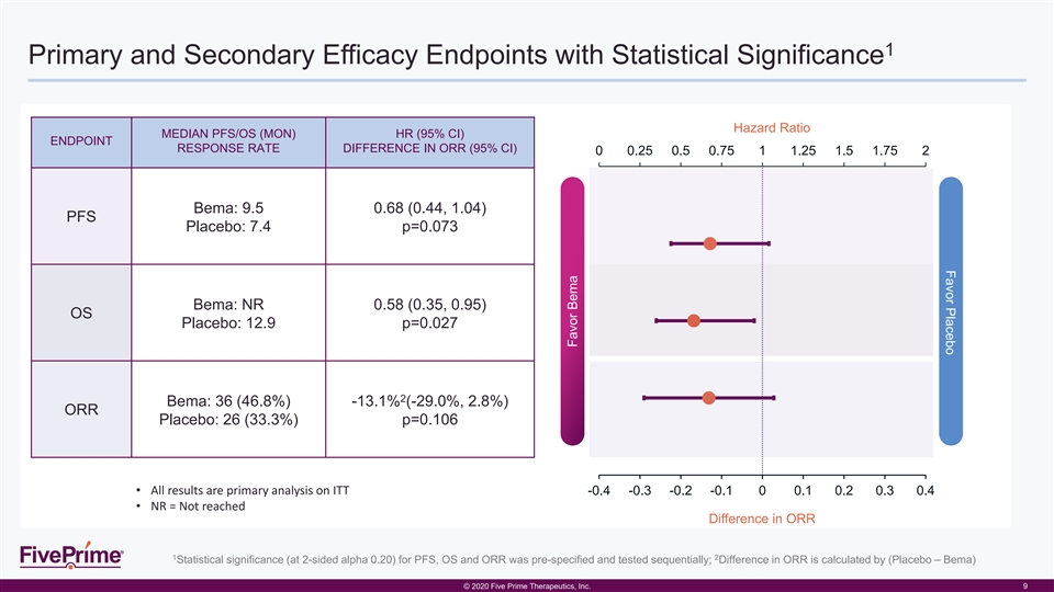 FIGHT Trial Design Patients Selected for FGFR2b+ Tumors (~30% of all non-HER2+ Gastric/GEJ Cancer) Key Eligibility Criteria • No prior therapy for unresectable Bema + mFOLFOX6 locally advanced or metastatic Primary endpoint (n = 77) gastric or GEJ adenocarcinoma Progression-Free • RECIST v1.1 evaluable disease Survival R VS • FGFR2b overexpression and/or 1:1 Secondary endpoints FGFR2 gene amplification Overall Survival Placebo + mFOLFOX6 • Non-HER2+ (n = 78) Response Rate Stratification Factors • Geographic region • Single dose of mFOLFOX during screening • Prior adjuvant or neo-adjuvant chemotherapy © © 2 202 020 0 F Fiiv ve e P Pr riim me e T The her ra ape peu ut tiic cs s, , I In nc c. . 8FIGHT Trial Design Patients Selected for FGFR2b+ Tumors (~30% of all non-HER2+ Gastric/GEJ Cancer) Key Eligibility Criteria • No prior therapy for unresectable Bema + mFOLFOX6 locally advanced or metastatic Primary endpoint (n = 77) gastric or GEJ adenocarcinoma Progression-Free • RECIST v1.1 evaluable disease Survival R VS • FGFR2b overexpression and/or 1:1 Secondary endpoints FGFR2 gene amplification Overall Survival Placebo + mFOLFOX6 • Non-HER2+ (n = 78) Response Rate Stratification Factors • Geographic region • Single dose of mFOLFOX during screening • Prior adjuvant or neo-adjuvant chemotherapy © © 2 202 020 0 F Fiiv ve e P Pr riim me e T The her ra ape peu ut tiic cs s, , I In nc c. . 8
