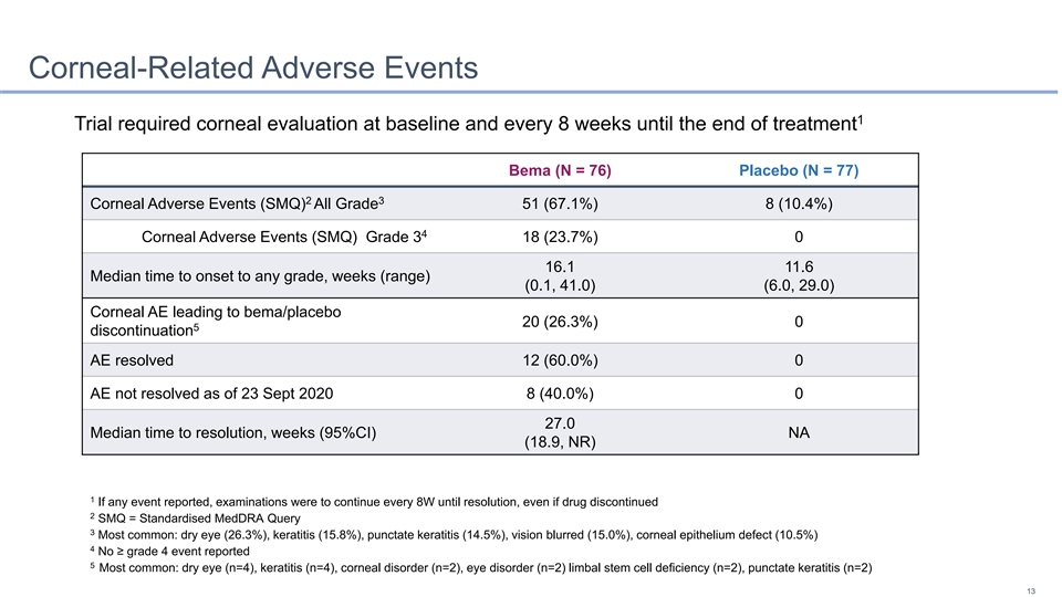 Corneal-Related Adverse Events 1 Trial required corneal evaluation at baseline and every 8 weeks until the end of treatment Bema (N = 76) Placebo (N = 77) 2 3 Corneal Adverse Events (SMQ) All Grade 51 (67.1%) 8 (10.4%) 4 Corneal Adverse Events (SMQ) Grade 3 18 (23.7%) 0 16.1 11.6 Median time to onset to any grade, weeks (range) (0.1, 41.0) (6.0, 29.0) Corneal AE leading to bema/placebo 20 (26.3%) 0 5 discontinuation AE resolved 12 (60.0%) 0 AE not resolved as of 23 Sept 2020 8 (40.0%) 0 27.0 Median time to resolution, weeks (95%CI) NA (18.9, NR) 1 If any event reported, examinations were to continue every 8W until resolution, even if drug discontinued 2 SMQ = Standardised MedDRA Query 3 Most common: dry eye (26.3%), keratitis (15.8%), punctate keratitis (14.5%), vision blurred (15.0%), corneal epithelium defect (10.5%) 4 No ≥ grade 4 event reported 5 Most common: dry eye (n=4), keratitis (n=4), corneal disorder (n=2), eye disorder (n=2) limbal stem cell deficiency (n=2), punctate keratitis (n=2) 13Corneal-Related Adverse Events 1 Trial required corneal evaluation at baseline and every 8 weeks until the end of treatment Bema (N = 76) Placebo (N = 77) 2 3 Corneal Adverse Events (SMQ) All Grade 51 (67.1%) 8 (10.4%) 4 Corneal Adverse Events (SMQ) Grade 3 18 (23.7%) 0 16.1 11.6 Median time to onset to any grade, weeks (range) (0.1, 41.0) (6.0, 29.0) Corneal AE leading to bema/placebo 20 (26.3%) 0 5 discontinuation AE resolved 12 (60.0%) 0 AE not resolved as of 23 Sept 2020 8 (40.0%) 0 27.0 Median time to resolution, weeks (95%CI) NA (18.9, NR) 1 If any event reported, examinations were to continue every 8W until resolution, even if drug discontinued 2 SMQ = Standardised MedDRA Query 3 Most common: dry eye (26.3%), keratitis (15.8%), punctate keratitis (14.5%), vision blurred (15.0%), corneal epithelium defect (10.5%) 4 No ≥ grade 4 event reported 5 Most common: dry eye (n=4), keratitis (n=4), corneal disorder (n=2), eye disorder (n=2) limbal stem cell deficiency (n=2), punctate keratitis (n=2) 13