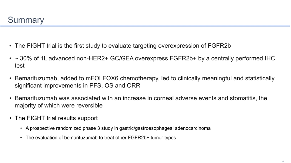 Summary • The FIGHT trial is the first study to evaluate targeting overexpression of FGFR2b • ~ 30% of 1L advanced non-HER2+ GC/GEA overexpress FGFR2b+ by a centrally performed IHC test • Bemarituzumab, added to mFOLFOX6 chemotherapy, led to clinically meaningful and statistically significant improvements in PFS, OS and ORR • Bemarituzumab was associated with an increase in corneal adverse events and stomatitis, the majority of which were reversible • The FIGHT trial results support • A prospective randomized phase 3 study in gastric/gastroesophageal adenocarcinoma • The evaluation of bemarituzumab to treat other FGFR2b+ tumor types 14Summary • The FIGHT trial is the first study to evaluate targeting overexpression of FGFR2b • ~ 30% of 1L advanced non-HER2+ GC/GEA overexpress FGFR2b+ by a centrally performed IHC test • Bemarituzumab, added to mFOLFOX6 chemotherapy, led to clinically meaningful and statistically significant improvements in PFS, OS and ORR • Bemarituzumab was associated with an increase in corneal adverse events and stomatitis, the majority of which were reversible • The FIGHT trial results support • A prospective randomized phase 3 study in gastric/gastroesophageal adenocarcinoma • The evaluation of bemarituzumab to treat other FGFR2b+ tumor types 14