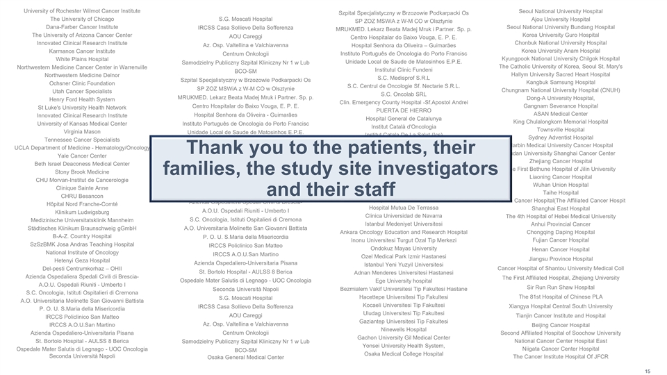 University of Rochester Wilmot Cancer Institute Seoul National University Hospital Szpital Specjalistyczny w Brzozowie Podkarpacki Os The University of Chicago S.G. Moscati Hospital Ajou University Hospital SP ZOZ MSWiA z W-M CO w Olsztynie Dana-Farber Cancer Institute Seoul National University Bundang Hospital IRCSS Casa Sollievo Della Sofferenza MRUKMED. Lekarz Beata Madej Mruk i Partner. Sp. p. The University of Arizona Cancer Center Korea University Guro Hospital AOU Careggi Centro Hospitalar do Baixo Vouga, E. P. E. Innovated Clinical Research Institute Chonbuk National University Hospital Az. Osp. Valtellina e Valchiavenna Hospital Senhora da Oliveira – Guimarães Summary Karmanos Cancer Institute Korea University Anam Hospital Centrum Onkologii Instituto Português de Oncologia do Porto Francisc Kyungpook National University Chilgok Hospital White Plains Hospital Unidade Local de Saude de Matosinhos E.P.E. Samodzielny Publiczny Szpital Kliniczny Nr 1 w Lub The Catholic University of Korea, Seoul St. Mary's Northwestern Medicine Cancer Center in Warrenville Institutul Clinic Fundeni BCO-SM Hallym University Sacred Heart Hospital Northwestern Medicine Delnor S.C. Medisprof S.R.L Szpital Specjalistyczny w Brzozowie Podkarpacki Os Kangbuk Samsung Hospital Ochsner Clinic Foundation S.C. Centrul de Oncologie Sf. Nectarie S.R.L. SP ZOZ MSWiA z W-M CO w Olsztynie Chungnam National University Hospital (CNUH) Utah Cancer Specialists S.C. Oncolab SRL MRUKMED. Lekarz Beata Madej Mruk i Partner. Sp. p. Dong-A University Hospital, Henry Ford Health System Clin. Emergency County Hospital -Sf.Apostol Andrei Gangnam Severance Hospital Centro Hospitalar do Baixo Vouga, E. P. E. St Luke's University Health Network PUERTA DE HIERRO ASAN Medical Center Hospital Senhora da Oliveira - Guimarães Innovated Clinical Research Institute Hospital General de Catalunya King Chulalongkorn Memorial Hospital University of Kansas Medical Center Instituto Português de Oncologia do Porto Francisc Institut Català d'Oncologia Townsville Hospital Virginia Mason Unidade Local de Saude de Matosinhos E.P.E. Institut Catala De La Salut (Ics) Sydney Adventist Hospital Tennessee Cancer Specialists Institutul Clinic Fundeni HOSPITAL UNIVERSITARIO FUNDACIÓN ALCORCÓN Harbin Medical University Cancer Hospital UCLA Department of Medicine - Hematology/Oncology S.C. Medisprof S.R.L Hospital Del Mar Thank you to the patients, their Fudan Universisity Shanghai Cancer Center Yale Cancer Center S.C. Centrul de Oncologie Sf. Nectarie S.R.L. Complejo Hospitalario Universitario A Coruna Zhejiang Cancer Hospital Beth Israel Deaconess Medical Center S.C. Oncolab SRL UNIV HOSP ARNAU DE VILANOVA The First Bethune Hospital of Jilin University Stony Brook Medicine families, the study site investigators HGUG MARAÑÓN Clin. Emergency County Hospital -Sf.Apostol Andrei Liaoning Cancer Hospital CHU Morvan-Institut de Cancerologie Hospital Madrid Norte Sanchinarro PUERTA DE HIERRO Wuhan Union Hospital Clinique Sainte Anne Hospital Parc Taulí Taihe Hospital Hospital General de Catalunya and their staff CHRU Besancon Complejo Hospitalario de Navarra Hunan Cancer Hospital(The Affiliated Cancer Hospit Azienda Ospedaliera Spedali Civili di Brescia- Hôpital Nord Franche-Comté Hospital Mutua De Terrassa Shanghai East Hospital A.O.U. Ospedali Riuniti - Umberto I Klinikum Ludwigsburg Clinica Universidad de Navarra The 4th Hospital of Hebei Medical University S.C. Oncologia, Istituti Ospitalieri di Cremona Medizinische Universitatsklinik Mannheim Istanbul Medeniyet Universitesi Anhui Provincial Cancer A.O. Universitaria Molinette San Giovanni Battista Städtisches Klinikum Braunschweig gGmbH Ankara Oncology Education and Research Hospital Chongqing Daping Hospital B-A-Z. Country Hospital P. O. U. S.Maria della Misericordia Fujian Cancer Hospital Inonu Universitesi Turgut Ozal Tip Merkezi SzSzBMK Josa Andras Teaching Hospital IRCCS Policlinico San Matteo Ondokuz Mayas University Henan Cancer Hospital National Institute of Oncology IRCCS A.O.U.San Martino Ozel Medical Park Izmir Hastanesi Jiangsu Province Hospital Hetenyi Geza Hospital Azienda Ospedaliero-Universitaria Pisana Istanbul Yeni Yuzyil Universitesi Cancer Hospital of Shantou University Medical Coll Del-pesti Centrumkorhaz – OHII St. Bortolo Hospital - AULSS 8 Berica Adnan Menderes Universitesi Hastanesi Azienda Ospedaliera Spedali Civili di Brescia- The First Affiliated Hospital, Zhejiang University Ospedale Mater Salutis di Legnago - UOC Oncologia Ege University hospital A.O.U. Ospedali Riuniti - Umberto I Sir Run Run Shaw Hospital Seconda Università Napoli Bezmialem Vakif Universitesi Tip Fakultesi Hastane S.C. Oncologia, Istituti Ospitalieri di Cremona The 81st Hospital of Chinese PLA Hacettepe Universitesi Tip Fakultesi S.G. Moscati Hospital A.O. Universitaria Molinette San Giovanni Battista Kocaeli Universitesi Tip Fakultesi IRCSS Casa Sollievo Della Sofferenza Xiangya Hospital Central South University P. O. U. S.Maria della Misericordia Uludag Universitesi Tip Fakultesi AOU Careggi Tianjin Cancer Institute and Hospital IRCCS Policlinico San Matteo Gaziantep Universitesi Tip Fakultesi Az. Osp. Valtellina e Valchiavenna IRCCS A.O.U.San Martino Beijing Cancer Hospital Ninewells Hospital Azienda Ospedaliero-Universitaria Pisana Centrum Onkologii Second Affiliated Hospital of Soochow University Gachon University Gil Medical Center St. Bortolo Hospital - AULSS 8 Berica National Cancer Center Hospital East Samodzielny Publiczny Szpital Kliniczny Nr 1 w Lub Yonsei University Health System, Ospedale Mater Salutis di Legnago - UOC Oncologia Niigata Cancer Center Hospital BCO-SM Osaka Medical College Hospital Seconda Università Napoli The Cancer Institute Hospital Of JFCR Osaka General Medical Center 15University of Rochester Wilmot Cancer Institute Seoul National University Hospital Szpital Specjalistyczny w Brzozowie Podkarpacki Os The University of Chicago S.G. Moscati Hospital Ajou Unive