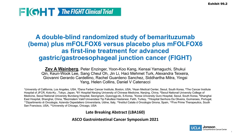 .2 A double-blind randomized study of bemarituzumab (bema) plus mFOLFOX6 versus placebo plus mFOLFOX6 as first-line treatment for advanced gastric/gastroesophageal junction cancer (FIGHT) Zev A Wainberg, Peter Enzinger, Yoon-Koo Kang, Kensai Yamaguchi, Shukui Qin, Keun-Wook Lee, Sang Cheul Oh, Jin Li, Haci Mehmet Turk, Alexandra Teixeira, Giovanni Gerardo Cardellino, Rachel Guardeno Sanchez, Siddhartha Mitra, Yingsi Yang, Helen Collins, Daniel V Catenacci 1 2 3 4 University of California, Los Angeles, USA, Dana Farber Cancer Institute, Boston, USA, Asan Medical Center, Seoul, South Korea, The Cancer Institute 5 6 Hospital of JFCR, Koto-Ku , Tokyo, Japan, 81 Hospital Nanjing University of Chinese Medicine, Nanjing, China, Seoul National University College of 7 8 Medicine, Seoul National University Bundang Hospital, Seongnam, Gyeonggi-do, S.Korea, Korea University Guro Hospital, Seoul, South Korea, Shanghai 9 10 East Hospital, Shanghai, China, Bezmialem Vakif Universitesi Tip Fakultesi Hastanesi, Fatih, Turkey, Hospital Senhora Da Oliveira, Guimaraes, Portugal, 11 12 13 Dipartimento di Oncologia, Azienda Ospedaliero Universitaria, Udine, Italy, Institut Catala d Oncologia Girona, Spain, Five Prime Therapeutics, South 14 San Francisco, USA, University of Chicago, Chicago, USA Late Breaking Abstract (LBA160) ASCO Gastrointestinal Cancer Symposium 2021 1.2 A double-blind randomized study of bemarituzumab (bema) plus mFOLFOX6 versus placebo plus mFOLFOX6 as first-line treatment for advanced gastric/gastroesophageal junction cancer (FIGHT) Zev A Wainberg, Peter Enzinger, Yoon-Koo Kang, Kensai Yamaguchi, Shukui Qin, Keun-Wook Lee, Sang Cheul Oh, Jin Li, Haci Mehmet Turk, Alexandra Teixeira, Giovanni Gerardo Cardellino, Rachel Guardeno Sanchez, Siddhartha Mitra, Yingsi Yang, Helen Collins, Daniel V Catenacci 1 2 3 4 University of California, Los Angeles, USA, Dana Farber Cancer Institute, Boston, USA, Asan Medical Center, Seoul, South Korea, The Cancer Institute 5 6 Hospital of JFCR, Koto-Ku , Tokyo, Japan, 81 Hospital Nanjing University of Chinese Medicine, Nanjing, China, Seoul National University College of 7 8 Medicine, Seoul National University Bundang Hospital, Seongnam, Gyeonggi-do, S.Korea, Korea University Guro Hospital, Seoul, South Korea, Shanghai 9 10 East Hospital, Shanghai, China, Bezmialem Vakif Universitesi Tip Fakultesi Hastanesi, Fatih, Turkey, Hospital Senhora Da Oliveira, Guimaraes, Portugal, 11 12 13 Dipartimento di Oncologia, Azienda Ospedaliero Universitaria, Udine, Italy, Institut Catala d Oncologia Girona, Spain, Five Prime Therapeutics, South 14 San Francisco, USA, University of Chicago, Chicago, USA Late Breaking Abstract (LBA160) ASCO Gastrointestinal Cancer Symposium 2021 1
