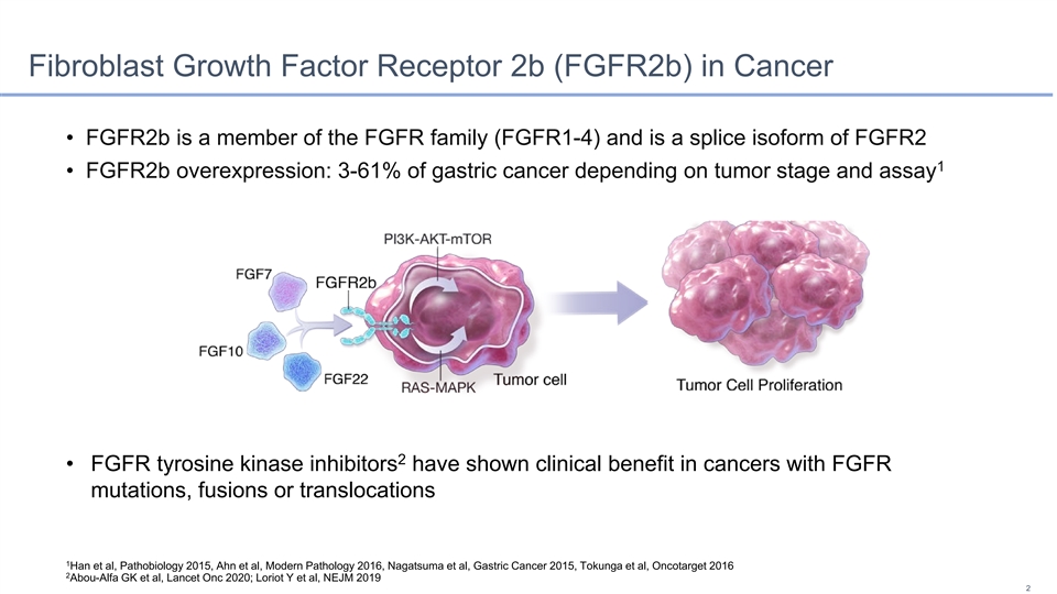 Fibroblast Growth Factor Receptor 2b (FGFR2b) in Cancer • FGFR2b is a member of the FGFR family (FGFR1-4) and is a splice isoform of FGFR2 1 • FGFR2b overexpression: 3-61% of gastric cancer depending on tumor stage and assay 2 • FGFR tyrosine kinase inhibitors have shown clinical benefit in cancers with FGFR mutations, fusions or translocations 1 Han et al, Pathobiology 2015, Ahn et al, Modern Pathology 2016, Nagatsuma et al, Gastric Cancer 2015, Tokunga et al, Oncotarget 2016 2 Abou-Alfa GK et al, Lancet Onc 2020; Loriot Y et al, NEJM 2019 2Fibroblast Growth Factor Receptor 2b (FGFR2b) in Cancer • FGFR2b is a member of the FGFR family (FGFR1-4) and is a splice isoform of FGFR2 1 • FGFR2b overexpression: 3-61% of gastric cancer depending on tumor stage and assay 2 • FGFR tyrosine kinase inhibitors have shown clinical benefit in cancers with FGFR mutations, fusions or translocations 1 Han et al, Pathobiology 2015, Ahn et al, Modern Pathology 2016, Nagatsuma et al, Gastric Cancer 2015, Tokunga et al, Oncotarget 2016 2 Abou-Alfa GK et al, Lancet Onc 2020; Loriot Y et al, NEJM 2019 2