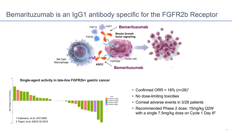 Bemarituzumab is an IgG1 antibody specific for the FGFR2b Receptor Bemarituzumab Bemarituzumab Single-agent activity in late-line FGFR2b+ gastric cancer 1 • Confirmed ORR = 18% (n=28) • No dose-limiting toxicities • Corneal adverse events in 3/28 patients • Recommended Phase 2 dose: 15mg/kg Q2W 2 with a single 7.5mg/kg dose on Cycle 1 Day 8 1 Catenacci, et al: JCO 2020 2 Tejani, et al: ASCO GI 2019 3Bemarituzumab is an IgG1 antibody specific for the FGFR2b Receptor Bemarituzumab Bemarituzumab Single-agent activity in late-line FGFR2b+ gastric cancer 1 • Confirmed ORR = 18% (n=28) • No dose-limiting toxicities • Corneal adverse events in 3/28 patients • Recommended Phase 2 dose: 15mg/kg Q2W 2 with a single 7.5mg/kg dose on Cycle 1 Day 8 1 Catenacci, et al: JCO 2020 2 Tejani, et al: ASCO GI 2019 3