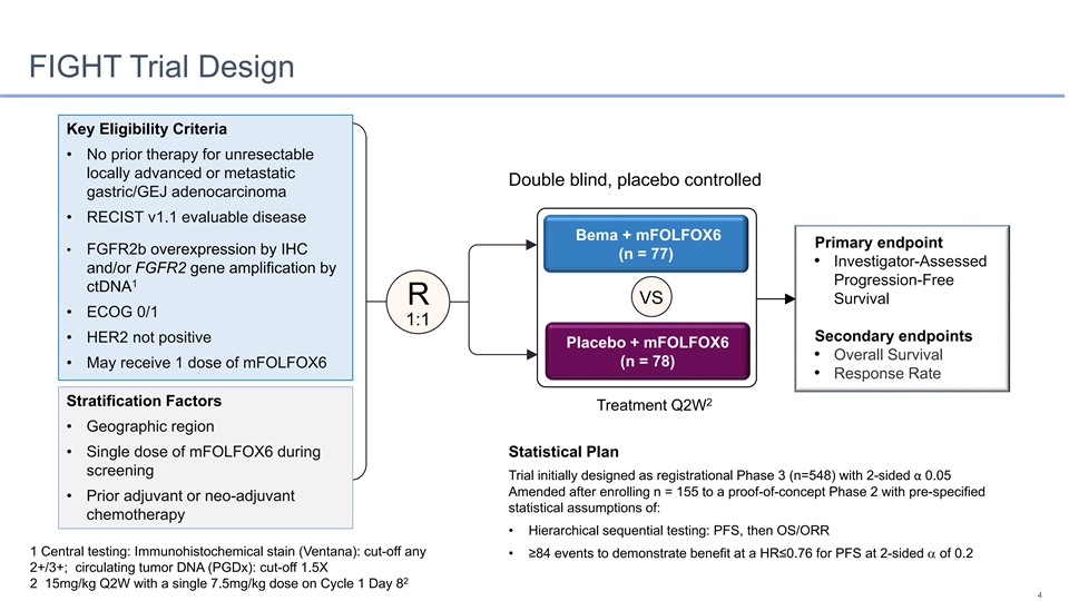 FIGHT Trial Design Key Eligibility Criteria • No prior therapy for unresectable locally advanced or metastatic Double blind, placebo controlled gastric/GEJ adenocarcinoma • RECIST v1.1 evaluable disease Bema + mFOLFOX6 Primary endpoint • FGFR2b overexpression by IHC (n = 77) • Investigator-Assessed and/or FGFR2 gene amplification by Progression-Free 1 ctDNA VS Survival R • ECOG 0/1 1:1 Secondary endpoints • HER2 not positive Placebo + mFOLFOX6 • Overall Survival (n = 78) • May receive 1 dose of mFOLFOX6 • Response Rate Stratification Factors 2 Treatment Q2W • Geographic region • Single dose of mFOLFOX6 during Statistical Plan screening Trial initially designed as registrational Phase 3 (n=548) with 2-sided α 0.05 Amended after enrolling n = 155 to a proof-of-concept Phase 2 with pre-specified • Prior adjuvant or neo-adjuvant statistical assumptions of: chemotherapy • Hierarchical sequential testing: PFS, then OS/ORR 1 Central testing: Immunohistochemical stain (Ventana): cut-off any • ≥84 events to demonstrate benefit at a HR≤0.76 for PFS at 2-sided α of 0.2 2+/3+; circulating tumor DNA (PGDx): cut-off 1.5X 2 2 15mg/kg Q2W with a single 7.5mg/kg dose on Cycle 1 Day 8 4FIGHT Trial Design Key Eligibility Criteria • No prior therapy for unresectable locally advanced or metastatic Double blind, placebo controlled gastric/GEJ adenocarcinoma • RECIST v1.1 evaluable disease Bema + mFOLFOX6 Primary endpoint • FGFR2b overexpression by IHC (n = 77) • Investigator-Assessed and/or FGFR2 gene amplification by Progression-Free 1 ctDNA VS Survival R • ECOG 0/1 1:1 Secondary endpoints • HER2 not positive Placebo + mFOLFOX6 • Overall Survival (n = 78) • May receive 1 dose of mFOLFOX6 • Response Rate Stratification Factors 2 Treatment Q2W • Geographic region • Single dose of mFOLFOX6 during Statistical Plan screening Trial initially designed as registrational Phase 3 (n=548) with 2-sided α 0.05 Amended after enrolling n = 155 to a proof-of-concept Phase 2 with pre-specified • Prior adjuvant or neo-adjuvant statistical assumptions of: chemotherapy • Hierarchical sequential testing: PFS, then OS/ORR 1 Central testing: Immunohistochemical stain (Ventana): cut-off any • ≥84 events to demonstrate benefit at a HR≤0.76 for PFS at 2-sided α of 0.2 2+/3+; circulating tumor DNA (PGDx): cut-off 1.5X 2 2 15mg/kg Q2W with a single 7.5mg/kg dose on Cycle 1 Day 8 4