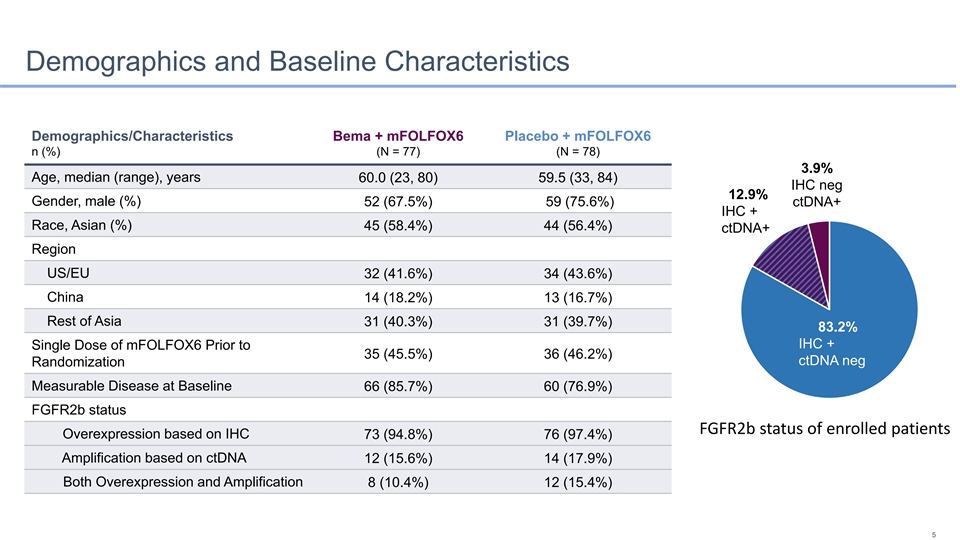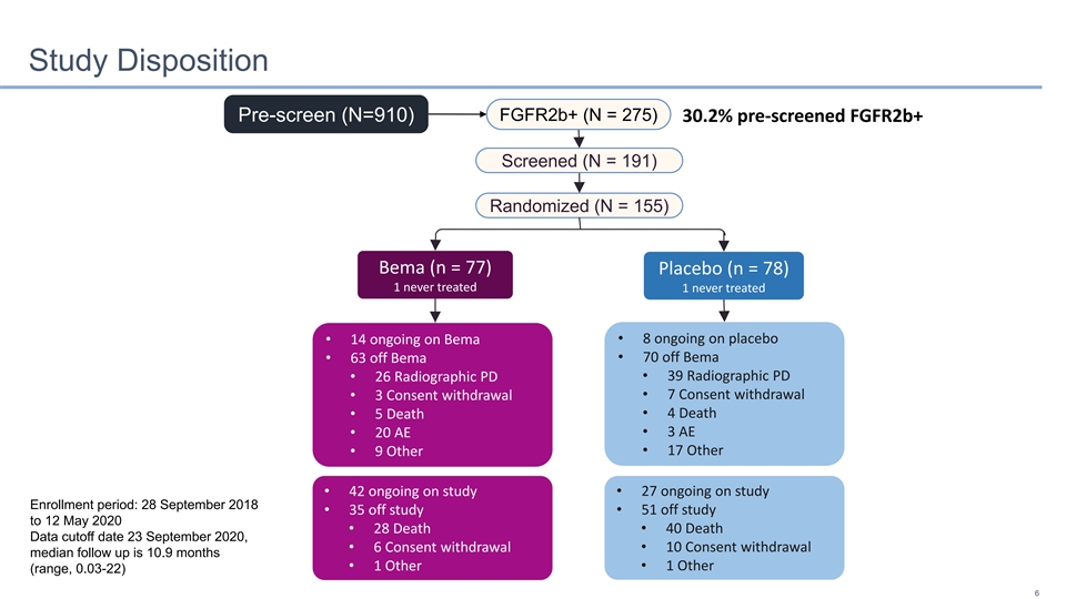 Demographics and Baseline Characteristics Demographics/Characteristics Bema + mFOLFOX6 Placebo + mFOLFOX6 n (%) (N = 77) (N = 78) 3.9% Age, median (range), years 60.0 (23, 80) 59.5 (33, 84) IHC neg 12.9% Gender, male (%) 52 (67.5%) 59 (75.6%) ctDNA+ IHC + Race, Asian (%) 45 (58.4%) 44 (56.4%) ctDNA+ Region US/EU 32 (41.6%) 34 (43.6%) China 14 (18.2%) 13 (16.7%) Rest of Asia 31 (40.3%) 31 (39.7%) 83.2% IHC + Single Dose of mFOLFOX6 Prior to 35 (45.5%) 36 (46.2%) ctDNA neg Randomization Measurable Disease at Baseline 66 (85.7%) 60 (76.9%) FGFR2b status FGFR2b status of enrolled patients Overexpression based on IHC 73 (94.8%) 76 (97.4%) Amplification based on ctDNA 12 (15.6%) 14 (17.9%) Both Overexpression and Amplification 8 (10.4%) 12 (15.4%) 5Demographics and Baseline Characteristics Demographics/Characteristics Bema + mFOLFOX6 Placebo + mFOLFOX6 n (%) (N = 77) (N = 78) 3.9% Age, median (range), years 60.0 (23, 80) 59.5 (33, 84) IHC neg 12.9% Gender, male (%) 52 (67.5%) 59 (75.6%) ctDNA+ IHC + Race, Asian (%) 45 (58.4%) 44 (56.4%) ctDNA+ Region US/EU 32 (41.6%) 34 (43.6%) China 14 (18.2%) 13 (16.7%) Rest of Asia 31 (40.3%) 31 (39.7%) 83.2% IHC + Single Dose of mFOLFOX6 Prior to 35 (45.5%) 36 (46.2%) ctDNA neg Randomization Measurable Disease at Baseline 66 (85.7%) 60 (76.9%) FGFR2b status FGFR2b status of enrolled patients Overexpression based on IHC 73 (94.8%) 76 (97.4%) Amplification based on ctDNA 12 (15.6%) 14 (17.9%) Both Overexpression and Amplification 8 (10.4%) 12 (15.4%) 5