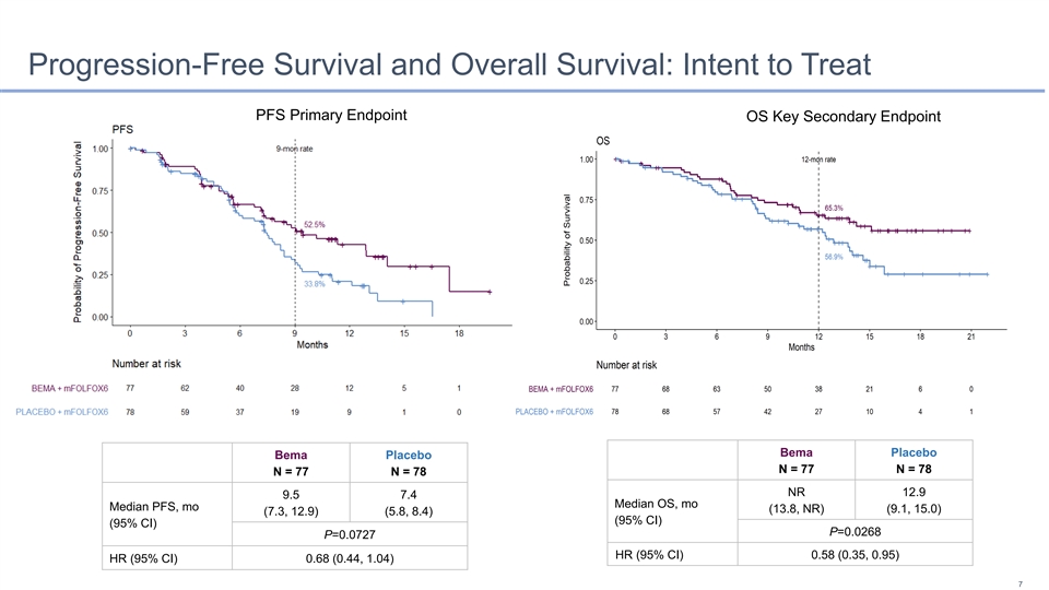 Study Disposition FGFR2b+ (N = 275) Pre-screen (N=910) 30.2% pre-screened FGFR2b+ Screened (N = 191) Randomized (N = 155) Bema (n = 77) Placebo (n = 78) 1 never treated 1 never treated • 8 ongoing on placebo • 14 ongoing on Bema • 70 off Bema • 63 off Bema • 39 Radiographic PD • 26 Radiographic PD • 7 Consent withdrawal • 3 Consent withdrawal • 4 Death • 5 Death • 20 AE • 3 AE • 17 Other • 9 Other • 42 ongoing on study • 27 ongoing on study Enrollment period: 28 September 2018 • 35 off study • 51 off study to 12 May 2020 • 28 Death • 40 Death Data cutoff date 23 September 2020, • 10 Consent withdrawal • 6 Consent withdrawal median follow up is 10.9 months • 1 Other • 1 Other (range, 0.03-22) 6Study Disposition FGFR2b+ (N = 275) Pre-screen (N=910) 30.2% pre-screened FGFR2b+ Screened (N = 191) Randomized (N = 155) Bema (n = 77) Placebo (n = 78) 1 never treated 1 never treated • 8 ongoing on placebo • 14 ongoing on Bema • 70 off Bema • 63 off Bema • 39 Radiographic PD • 26 Radiographic PD • 7 Consent withdrawal • 3 Consent withdrawal • 4 Death • 5 Death • 20 AE • 3 AE • 17 Other • 9 Other • 42 ongoing on study • 27 ongoing on study Enrollment period: 28 September 2018 • 35 off study • 51 off study to 12 May 2020 • 28 Death • 40 Death Data cutoff date 23 September 2020, • 10 Consent withdrawal • 6 Consent withdrawal median follow up is 10.9 months • 1 Other • 1 Other (range, 0.03-22) 6
