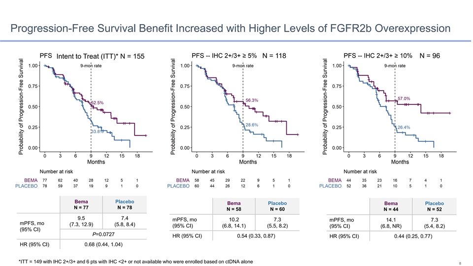 Progression-Free Survival and Overall Survival: Intent to Treat PFS Primary Endpoint OS Key Secondary Endpoint Bema Placebo Bema Placebo N = 77 N = 78 N = 77 N = 78 NR 12.9 9.5 7.4 Median OS, mo Median PFS, mo (13.8, NR) (9.1, 15.0) (7.3, 12.9) (5.8, 8.4) (95% CI) (95% CI) P=0.0268 P=0.0727 HR (95% CI) 0.58 (0.35, 0.95) HR (95% CI) 0.68 (0.44, 1.04) 7Progression-Free Survival and Overall Survival: Intent to Treat PFS Primary Endpoint OS Key Secondary Endpoint Bema Placebo Bema Placebo N = 77 N = 78 N = 77 N = 78 NR 12.9 9.5 7.4 Median OS, mo Median PFS, mo (13.8, NR) (9.1, 15.0) (7.3, 12.9) (5.8, 8.4) (95% CI) (95% CI) P=0.0268 P=0.0727 HR (95% CI) 0.58 (0.35, 0.95) HR (95% CI) 0.68 (0.44, 1.04) 7