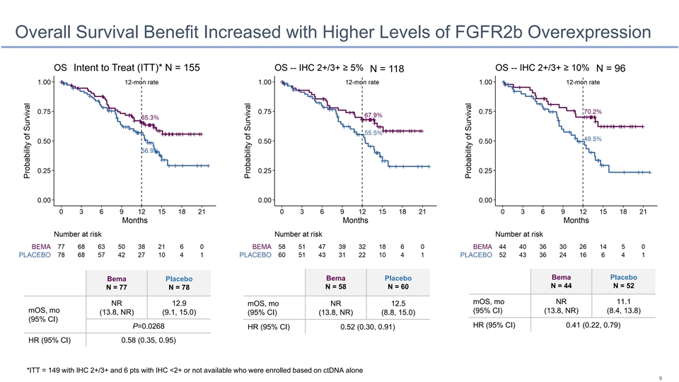 Progression-Free Survival Benefit Increased with Higher Levels of FGFR2b Overexpression N = 118 N = 96 Intent to Treat (ITT)* N = 155 Bema Placebo Bema Placebo Bema Placebo N = 77 N = 78 N = 58 N = 60 N = 44 N = 52 9.5 7.4 mPFS, mo 10.2 7.3 mPFS, mo 14.1 7.3 mPFS, mo (7.3, 12.9) (5.8, 8.4) (95% CI) (6.8, 14.1) (5.5, 8.2) (95% CI) (6.8, NR) (5.4, 8.2) (95% CI) P=0.0727 HR (95% CI) 0.54 (0.33, 0.87) HR (95% CI) 0.44 (0.25, 0.77) HR (95% CI) 0.68 (0.44, 1.04) *ITT = 149 with IHC 2+/3+ and 6 pts with IHC <2+ or not available who were enrolled based on ctDNA alone 8Progression-Free Survival Benefit Increased with Higher Levels of FGFR2b Overexpression N = 118 N = 96 Intent to Treat (ITT)* N = 155 Bema Placebo Bema Placebo Bema Placebo N = 77 N = 78 N = 58 N = 60 N = 44 N = 52 9.5 7.4 mPFS, mo 10.2 7.3 mPFS, mo 14.1 7.3 mPFS, mo (7.3, 12.9) (5.8, 8.4) (95% CI) (6.8, 14.1) (5.5, 8.2) (95% CI) (6.8, NR) (5.4, 8.2) (95% CI) P=0.0727 HR (95% CI) 0.54 (0.33, 0.87) HR (95% CI) 0.44 (0.25, 0.77) HR (95% CI) 0.68 (0.44, 1.04) *ITT = 149 with IHC 2+/3+ and 6 pts with IHC <2+ or not available who were enrolled based on ctDNA alone 8