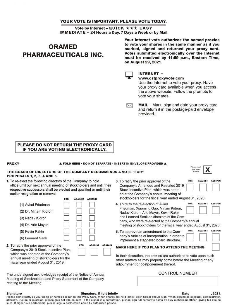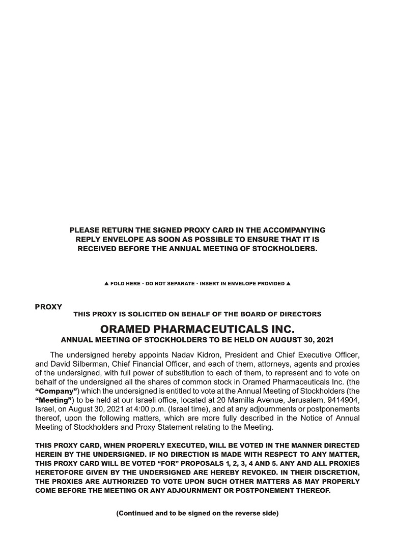 You are cordially invited to attend the Annual Meeting of Stockholders (the “Annual Meeting”) of Oramed Pharmaceuticals Inc. (the “Company,” “we,” “us,” or “our”). The Annual Meeting will be held at our Israeli office, located at 20 Mamilla Avenue, Jerusalem, 9414904, Israel, on August 30, 2021, at 4:00 p.m. (Israel time). We intend to hold the annual meeting for the following purposes: