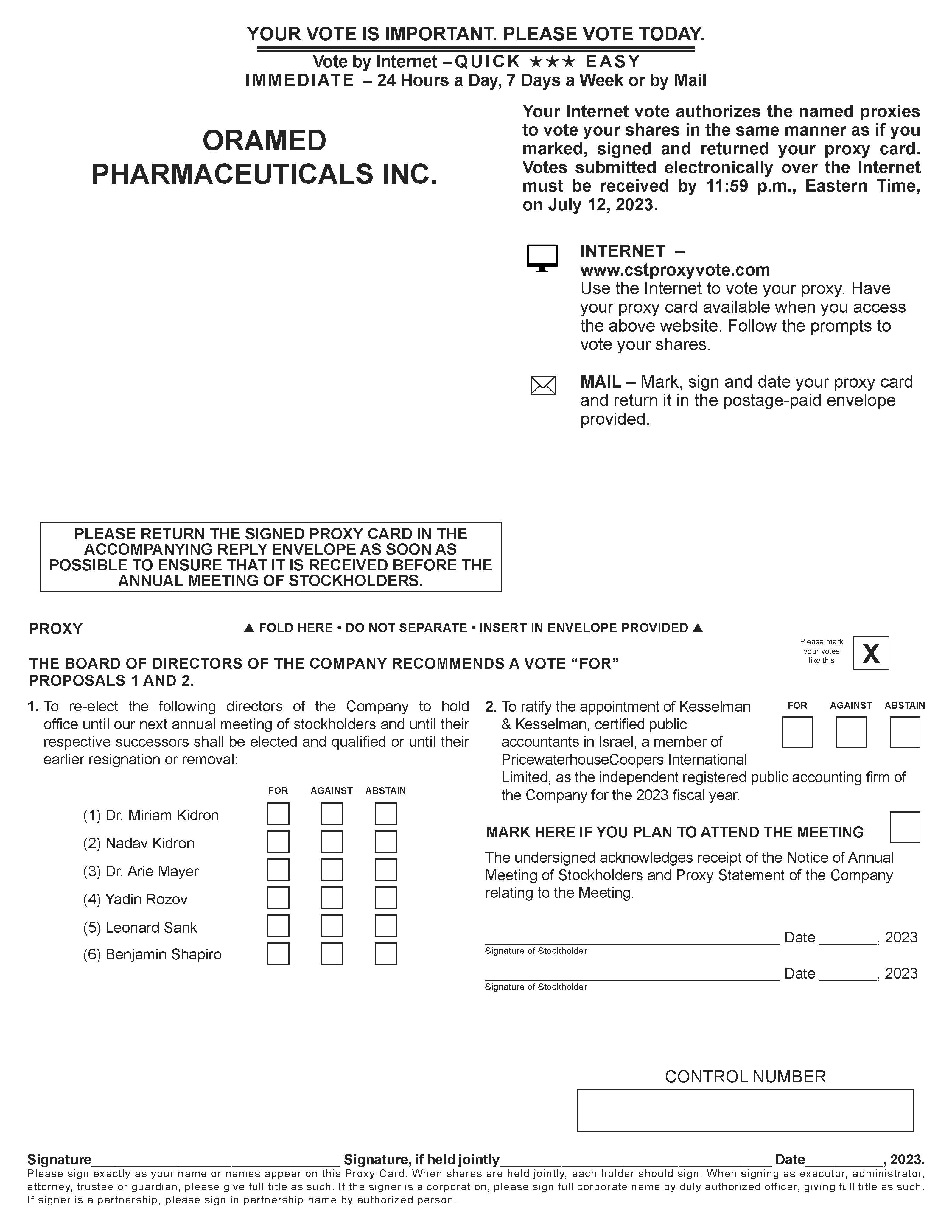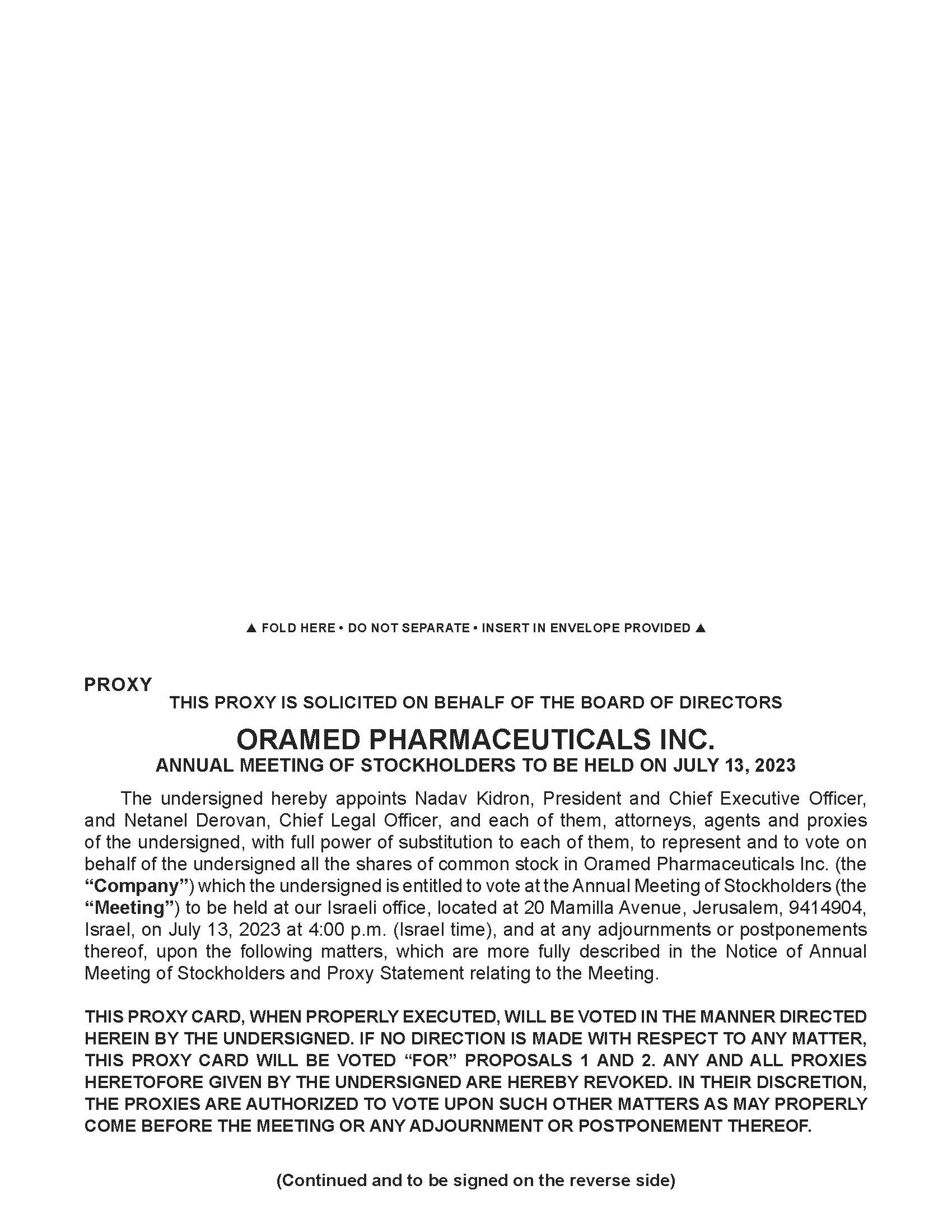 You are cordially invited to attend the Annual Meeting of Stockholders (the “Annual Meeting”) of Oramed Pharmaceuticals Inc. (the “Company,” “we,” “us,” or “our”). The Annual Meeting will be held at our Israeli office, located at 20 Mamilla Avenue, Jerusalem, 9414904, Israel, on July 13, 2023, at 4:00 p.m. (Israel time). We intend to hold the annual meeting for the following purposes: