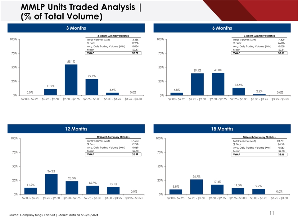 MMLP Units Traded Analysis | (% of Total Volume) 3 Months 6 Months 3 Month Summary Statistics 6 Month S 3u M mma onthry Statistics 6 Month 100% Total Volume (MM) 3.436 100% Total Volume (MM) 7.329 % Float 12.2% % Float 26.0% Avg. Daily Trading Volume (MM) 0.054 Avg. Daily Trading Volume (MM) 0.058 Mean $2.67 Mean $2.54 VWAP $2.71 VWAP $2.56 75% 75% 55.1% 50% 50% 40.0% 39.4% 29.1% 25% 25% 13.6% 11.2% 4.6% 4.8% 2.2% 0.0% 0.0% 0.0% 0% 0% $2.00 - $2.25 $2.25 - $2.50 $2.50 - $2.75 $2.75 - $3.00 $3.00 - $3.25 $3.25 - $3.50 $2.00 - $2.25 $2.25 - $2.50 $2.50 - $2.75 $2.75 - $3.00 $3.00 - $3.25 $3.25 - $3.50 12 Months 18 Months 12 Month Summary Statistics 18 Month 1S 2u M mma onthry Statistics 18 Month 100% 100% Total Volume (MM) 17.533 Total Volume (MM) 23.731 % Float 62.3% % Float 84.3% Avg. Daily Trading Volume (MM) 0.069 Avg. Daily Trading Volume (MM) 0.063 Mean $2.50 Mean $2.60 75% 75% VWAP $2.59 VWAP $2.66 50% 50% 36.2% 26.7% 23.5% 25% 25% 17.4% 15.3% 13.1% 11.9% 11.3% 9.7% 8.8% 0.0% 0.0% 0% 0% $2.00 - $2.25 $2.25 - $2.50 $2.50 - $2.75 $2.75 - $3.00 $3.00 - $3.25 $3.25 - $3.50 $2.00 - $2.25 $2.25 - $2.50 $2.50 - $2.75 $2.75 - $3.00 $3.00 - $3.25 $3.25 - $3.50 11 Source: Company filings, FactSet | Market data as of 5/23/2024