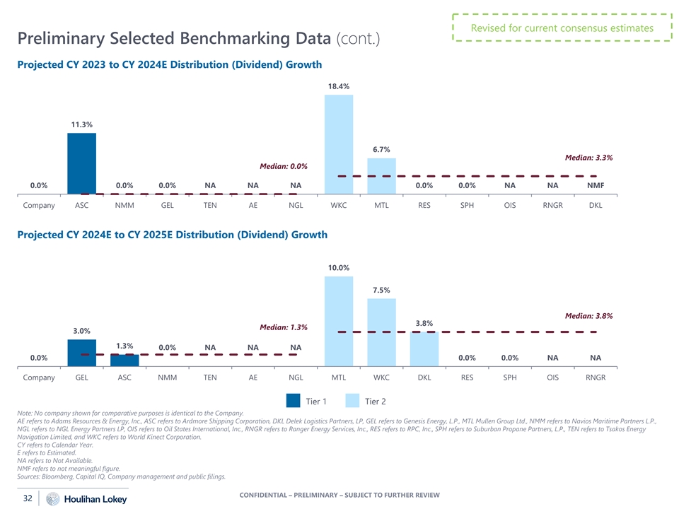 Revised for updated financials where Preliminary Selected Benchmarking Data (cont.) available LTM Net Debt to Adjusted EBITDA 0 0 0 0 0 0 0 0 0 0 0 0 0 0 5.1x 4.7x 4.6x 4.0x 3.8x 3.2x Median: 2.6x 2.1x 2.3x Median: 1.4x 1.4x 1.0x 0.2x 0.1x 0.0x -1.0x Company [1] ASC AE NMM TEN NGL GEL RES RNGR WKC OIS MTL DKL SPH CY 2023 Distribution (Dividend) Yield [2] 0 0 0 0 0 0 0 0 0 0 0 0 0 0 7.0% 5.6% 4.9% 4.2% 3.9% Median: 2.2% Median: 2.4% 2.3% 2.2% 2.1% 1.7% 0.9% 0.7% 0.4% 0.0% 0.0% Company [3] ASC GEL TEN AE NMM NGL SPH MTL RES DKL WKC RNGR OIS Tier 1 Tier 2 Note: No company shown for comparative purposes is identical to the Company. 1. LTM Adjusted EBITDA shown proforma for the Company's exit from the Butane optimization business. 2. Based on public trading prices of common stock as of 7/26/24. 3. Represents figures as of 5/23/24, the last full day of trading prior to the announcement of the Offer. AE refers to Adams Resources & Energy, Inc., ASC refers to Ardmore Shipping Corporation, DKL Delek Logistics Partners, LP, GEL refers to Genesis Energy, L.P., MTL Mullen Group Ltd., NMM refers to Navios Maritime Partners L.P., NGL refers to NGL Energy Partners LP, OIS refers to Oil States International, Inc., RNGR refers to Ranger Energy Services, Inc., RES refers to RPC, Inc., SPH refers to Suburban Propane Partners, L.P., TEN refers to Tsakos Energy Navigation Limited, and WKC refers to World Kinect Corporation. Adjusted EBITDA refers to Earnings Before Interest, Taxes, Depreciation and Amortization, adjusted for certain non-recurring items; CY refers to Calendar Year; LTM refers to Latest 12 Months. Sources: Bloomberg, Capital IQ, Company management and public filings. CONFIDENTIAL – PRELIMINARY – SUBJECT TO FURTHER REVIEW 31