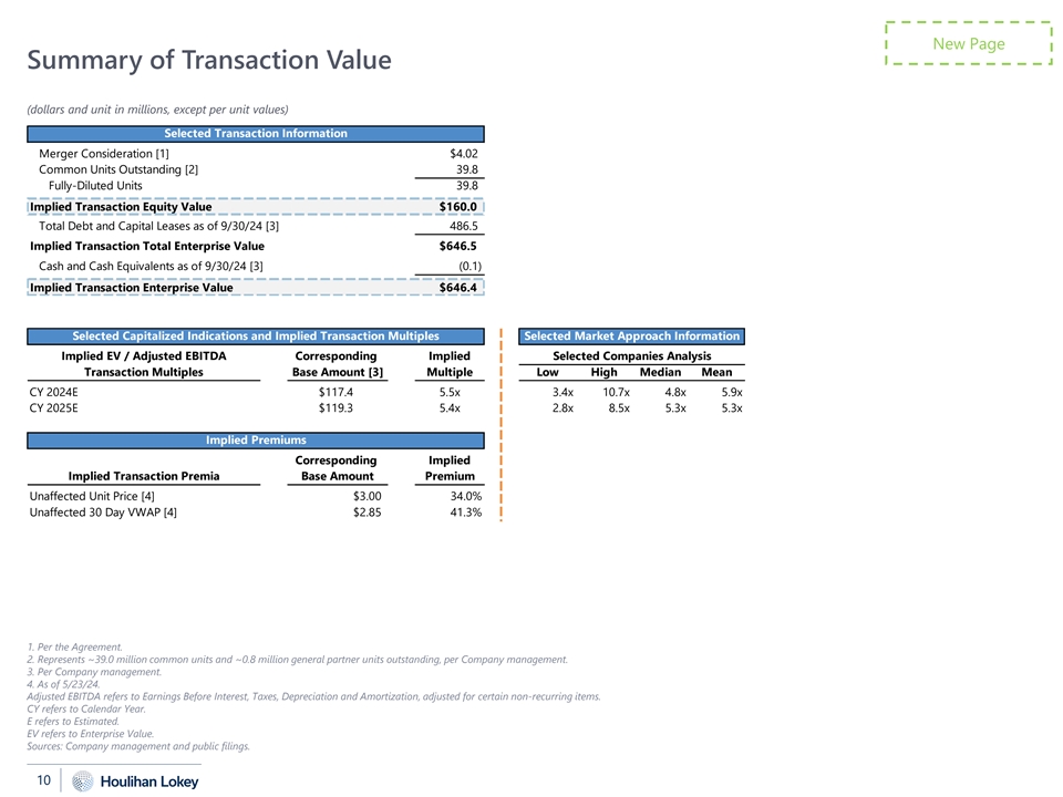 New Page Summary of Transaction Value (dollars and unit in millions, except per unit values) Selected Transaction Information Merger Consideration [1] $4.02 Common Units Outstanding [2] 39.8 Fully-Diluted Units 39.8 Implied Transaction Equity Value $160.0 Total Debt and Capital Leases as of 9/30/24 [3] 486.5 Implied Transaction Total Enterprise Value $646.5 Cash and Cash Equivalents as of 9/30/24 [3] (0.1) Implied Transaction Enterprise Value $646.4 Selected Capitalized Indications and Implied Transaction Multiples Selected Market Approach Information Implied EV / Adjusted EBITDA Corresponding Implied Selected Companies Analysis Transaction Multiples Base Amount [3] Multiple Low High Median Mean CY 2024E $117.4 5.5x 3.4x 10.7x 4.8x 5.9x CY 2025E $119.3 5.4x 2.8x 8.5x 5.3x 5.3x Implied Premiums Corresponding Implied Implied Transaction Premia Base Amount Premium Unaffected Unit Price [4] $3.00 34.0% Unaffected 30 Day VWAP [4] $2.85 41.3% 1. Per the Agreement. 2. Represents ~39.0 million common units and ~0.8 million general partner units outstanding, per Company management. 3. Per Company management. 4. As of 5/23/24. Adjusted EBITDA refers to Earnings Before Interest, Taxes, Depreciation and Amortization, adjusted for certain non-recurring items. CY refers to Calendar Year. E refers to Estimated. EV refers to Enterprise Value. Sources: Company management and public filings. 10