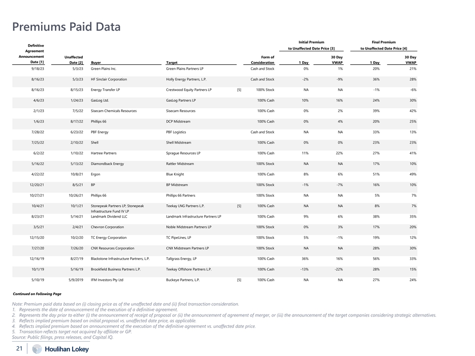 Premiums Paid Data Initial Premium Final Premium Definitive to Unaffected Date Price [3] to Unaffected Date Price [4] Agreement Announcement Unaffected Form of 30 Day 30 Day Date [1] Date [2] Buyer Target Consideration 1 Day VWAP 1 Day VWAP 9/18/23 5/3/23 Green Plains Inc. Green Plains Partners LP Cash and Stock 0% 1% 20% 21% 8/16/23 5/3/23 HF Sinclair Corporation Holly Energy Partners, L.P. Cash and Stock -2% -9% 36% 28% 8/16/23 8/15/23 Energy Transfer LP Crestwood Equity Partners LP [5] 100% Stock NA NA -1% -6% 4/6/23 1/24/23 GasLog Ltd. GasLog Partners LP 100% Cash 10% 16% 24% 30% 2/1/23 7/5/22 Sisecam Chemicals Resources Sisecam Resources 100% Cash 0% 2% 39% 42% 1/6/23 8/17/22 Phillips 66 DCP Midstream 100% Cash 0% 4% 20% 25% 7/28/22 6/23/22 PBF Energy PBF Logistics Cash and Stock NA NA 33% 13% 7/25/22 2/10/22 Shell Shell Midstream 100% Cash 0% 0% 23% 23% 6/2/22 1/10/22 Hartree Partners Sprague Resources LP 100% Cash 11% 22% 27% 41% 5/16/22 5/13/22 Diamondback Energy Rattler Midstream 100% Stock NA NA 17% 10% 4/22/22 10/8/21 Ergon Blue Knight 100% Cash 8% 6% 51% 49% 12/20/21 8/5/21 BP BP Midstream 100% Stock -1% -7% 16% 10% 10/27/21 10/26/21 Phillips 66 Phillips 66 Partners 100% Stock NA NA 5% 7% 10/4/21 10/1/21 Stonepeak Partners LP; Stonepeak Teekay LNG Partners L.P. [5] 100% Cash NA NA 8% 7% Infrastructure Fund IV LP 8/23/21 5/14/21 Landmark Dividend LLC Landmark Infrastructure Partners LP 100% Cash 9% 6% 38% 35% 3/5/21 2/4/21 Chevron Corporation Noble Midstream Partners LP 100% Stock 0% 3% 17% 20% 12/15/20 10/2/20 TC Energy Corporation TC PipeLines, LP 100% Stock 5% -1% 19% 12% 7/27/20 7/26/20 CNX Resources Corporation CNX Midstream Partners LP 100% Stock NA NA 28% 30% 12/16/19 8/27/19 Blackstone Infrastructure Partners, L.P. Tallgrass Energy, LP 100% Cash 36% 16% 56% 33% 10/1/19 5/16/19 Brookfield Business Partners L.P. Teekay Offshore Partners L.P. 100% Cash -13% -22% 28% 15% 5/10/19 5/9/2019 IFM Investors Pty Ltd Buckeye Partners, L.P. [5] 100% Cash NA NA 27% 24% Continued on Following Page Note: Premium paid data based on (i) closing price as of the unaffected date and (ii) final transaction consideration. 1. Represents the date of announcement of the execution of a definitive agreement. 2. Represents the day prior to either (i) the announcement of receipt of proposal or (ii) the announcement of agreement of merger, or (iii) the announcement of the target companies considering strategic alternatives. 3. Reflects implied premium based on initial proposal vs. unaffected date price, as applicable. 4. Reflects implied premium based on announcement of the execution of the definitive agreement vs. unaffected date price. 5. Transaction reflects target not acquired by affiliate or GP. Source: Public filings, press releases, and Capital IQ. 21