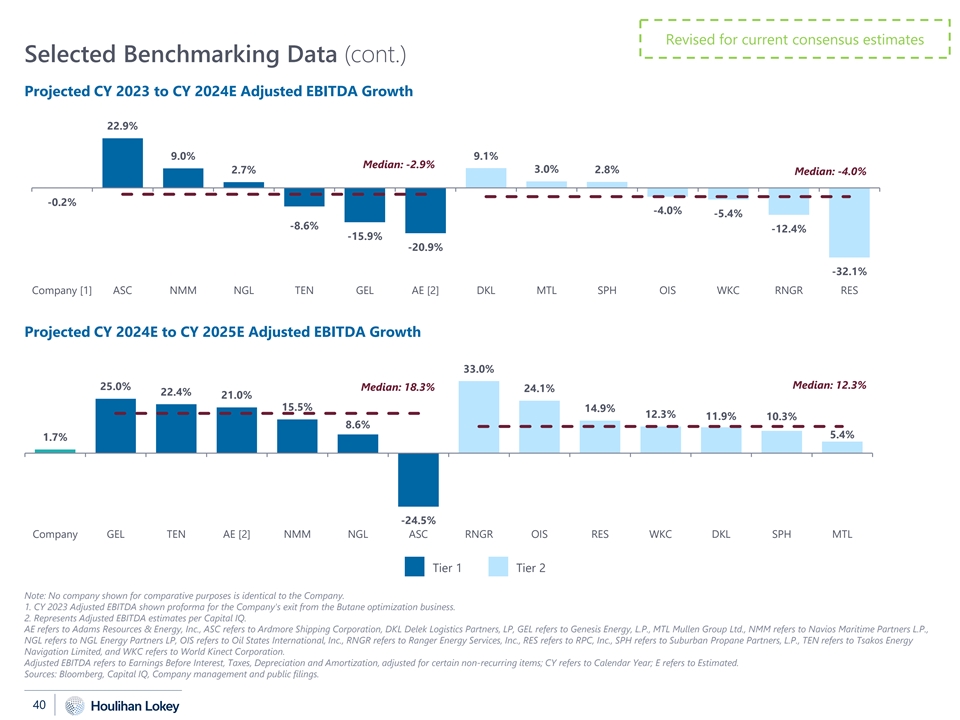 Revised for current consensus estimates Selected Benchmarking Data (cont.) Projected CY 2023 to CY 2024E Distribution (Dividend) Growth 0 0 0 0 0 0 0 0 0 0 0 0 0 0 17.9% 10.0% Median: 5.0% 6.1% Median: 3.1% 5.0% 0.0% 0.0% NA NA NA 0.0% 0.0% NA NA NMF Company ASC GEL NMM TEN AE NGL WKC MTL RES SPH OIS RNGR DKL Projected CY 2024E to CY 2025E Distribution (Dividend) Growth 0 0 0 0 0 0 0 0 0 0 0 0 0 0 12.6% 9.9% 9.0% Median: 0.0% Median: 4.0% 4.0% 0.0% 0.0% NA NA NA 0.0% NA 0.0% NA -15.0% Company GEL NMM ASC TEN AE NGL WKC MTL DKL RES SPH OIS RNGR Tier 1 Tier 2 Note: No company shown for comparative purposes is identical to the Company. AE refers to Adams Resources & Energy, Inc., ASC refers to Ardmore Shipping Corporation, DKL Delek Logistics Partners, LP, GEL refers to Genesis Energy, L.P., MTL Mullen Group Ltd., NMM refers to Navios Maritime Partners L.P., NGL refers to NGL Energy Partners LP, OIS refers to Oil States International, Inc., RNGR refers to Ranger Energy Services, Inc., RES refers to RPC, Inc., SPH refers to Suburban Propane Partners, L.P., TEN refers to Tsakos Energy Navigation Limited, and WKC refers to World Kinect Corporation. CY refers to Calendar Year. E refers to Estimated. NA refers to Not Available. NMF refers to not meaningful figure. Sources: Bloomberg, Capital IQ, Company management and public filings. 39