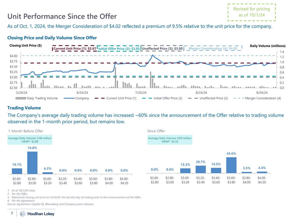 Revised for pricing as of 10/1/24 Unit Performance Since the Offer As of Oct. 1, 2024, the Merger Consideration of $4.02 reflected a premium of 9.5% relative to the unit price for the company. Closing Price and Daily Volume Since Offer Closing Unit Price ($) Daily Volume (millions) Current Unit Price [1]: $3.67 Unaffected Price [3]: $3.00 Merger Consideration [4]: $4.02 Initial Offer Price [2]: $3.05 1.4 $4.00 1.2 $3.75 1.0 $3.50 0.8 $3.25 0.6 $3.00 0.4 $2.75 0.2 $2.50 0.0 5/24/24 6/24/24 7/24/24 8/24/24 9/24/24 Daily Trading Volume Company Current Unit Price [1] Initial Offer Price [2] Unaffected Price [3] Merger Consideration [4] Trading Volume The Company’s average daily trading volume has increased ~60% since the announcement of the Offer relative to trading volume observed in the 1-month prior period, but remains low. 1-Month Before Offer Since Offer Average Daily Volume: 0.06 million Average Daily Volume: 0.09 million 1 1 VWAP : $2.89 VWAP : $3.52 74.8% 43.6% 20.7% 14.5% 19.1% 13.3% 4.4% 6.2% 3.5% 0.0% 0.0% 0.0% 0.0% 0.0% 0.0% 0.0% $2.60- $2.80- $3.00- $3.20- $3.40- $3.60- $3.80- $4.00- $2.60- $2.80- $3.00- $3.20- $3.40- $3.60- $3.80- $4.00- $2.80 $3.00 $3.20 $3.40 $3.60 $3.80 $4.00 $4.20 $2.80 $3.00 $3.20 $3.40 $3.60 $3.80 $4.00 $4.20 1. As of 10/1/24 close. 2. Per the Offer. 3. Represents closing unit price on 5/23/24, the last full day of trading prior to the announcement of the Offer. 4. Per the Agreement. Source: Agreement, Capital IQ, Bloomberg and Company press releases. 7