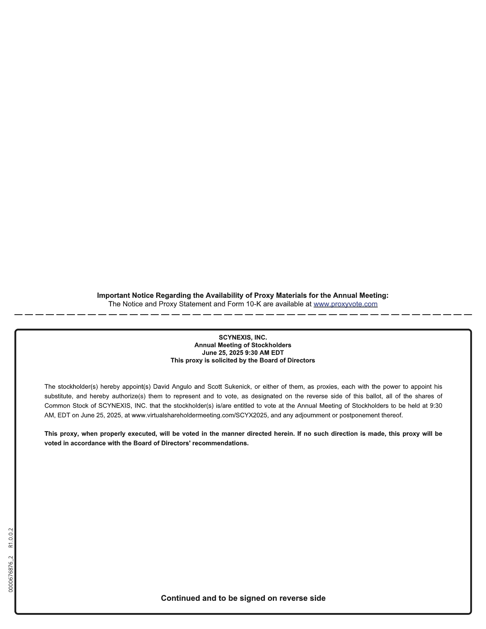 If you return a signed and dated proxy card or otherwise vote without marking voting selections, your shares will be voted, “For” the election of all our seven nominees for director, “For” the ratification of the Audit Committee’s selection of Deloitte & Touche LLP as the independent registered public accounting firm of SCYNEXIS for its fiscal year ending December 31, 2025, and “For” the advisory approval of the compensation of our named executive officers as disclosed in this proxy statement.