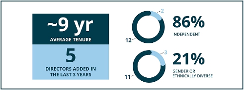While the Governance/Nominating Committee does not have a formal policy regarding diversity, when assessing potential director nominees, gender, racial and ethnic diversity, as well as different perspectives and experience are considered to enhance the deliberation and strategic decision-making processes of our board of directors. Currently, 14% of our directors are women and 14% designate themselves as racially or ethnically diverse.