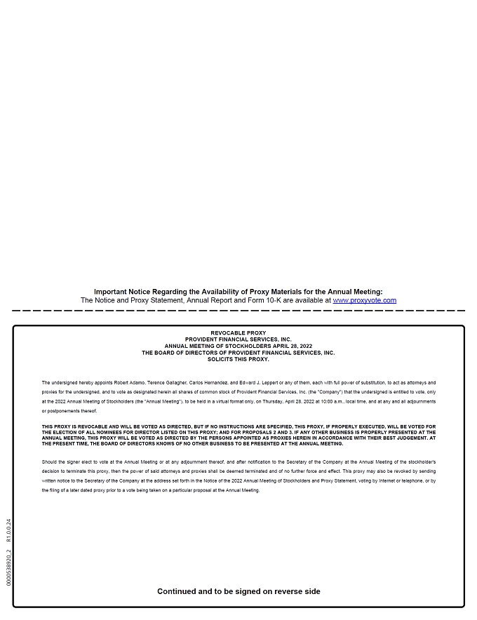 AN ADDITIONAL COPY OF OUR ANNUAL REPORT ON FORM 10-K (WITHOUT EXHIBITS) FOR THE YEAR ENDED DECEMBER 31, 2021, AS FILED WITH THE SEC, WILL BE FURNISHED WITHOUT CHARGE TO STOCKHOLDERS UPON WRITTEN REQUEST TO THE CORPORATE SECRETARY, PROVIDENT FINANCIAL SERVICES, INC., 111 WOOD AVENUE SOUTH, P.O BOX 1001, ISELIN, NEW JERSEY 08830-1001.