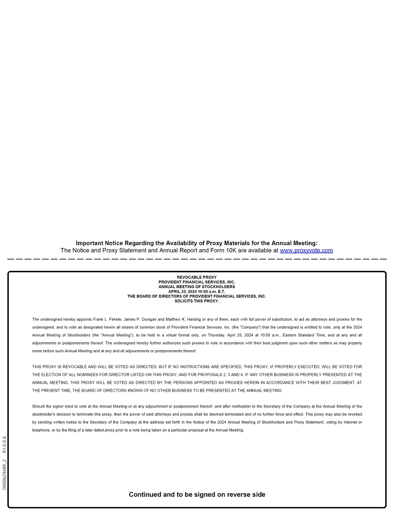 NOTICE IS HEREBY GIVEN THAT the 2024 Annual Meeting of Stockholders of Provident Financial Services, Inc. will be held in a virtual format on Thursday, April 25, 2024, at 10:00 a.m., Eastern Standard Time to consider and vote upon the following matters: