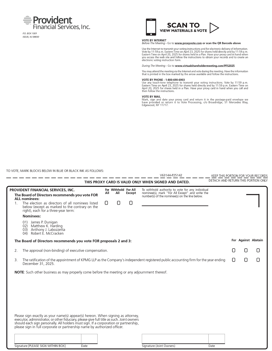 P.O. BOX 1001 ISELIN, NJ 08830 SCAN TO VIEW MATERIALS & VOTE VOTE BY INTERNET Before The Meeting - Go to www.proxyvote.com or scan the QR Barcode above Use the Internet to transmit your voting instructions and for electronic delivery of information. Vote by 11:59 p.m. Eastern Time on April 23, 2025 for shares held directly and by 11:59 p.m. Eastern Time on April 20, 2025 for shares held in a Plan. Have your proxy card in hand when you access the web site and follow the instructions to obtain your records and to create an electronic voting instruction form. During The Meeting - Go to www.virtualshareholdermeeting.com/PFS2025 You may attend the meeting via the Internet and vote during the meeting. Have the information that is printed in the box marked by the arrow available and follow the instructions. VOTE BY PHONE - 1-800-690-6903 Use any touch-tone telephone to transmit your voting instructions. Vote by 11:59 p.m. Eastern Time on April 23, 2025 for shares held directly and by 11:59 p.m. Eastern Time on April 20, 2025 for shares held in a Plan. Have your proxy card in hand when you call and then follow the instructions. VOTE BY MAIL Mark, sign and date your proxy card and return it in the postage-paid envelope we have provided or return it to Vote Processing, c/o Broadridge, 51 Mercedes Way, Edgewood, NY 11717. TO VOTE, MARK BLOCKS BELOW IN BLUE OR BLACK INK AS FOLLOWS: V63144-P25142 KEEP THIS PORTION FOR YOUR RECORDS THIS PROXY CARD IS VALID ONLY WHEN SIGNED AND DATED. DETACH AND RETURN THIS PORTION ONLY PROVIDENT FINANCIAL SERVICES, INC. For All Withhold All For All Except The Board of Directors recommends you vote FOR ALL nominees: 1. The election as directors of all nominees listed below (except as marked to the contrary on the right), each for a three-year term: Nominees: 01) James P. Dunigan 02) Matthew K. Harding 03) Anthony J. Labozzetta 04) Robert E. McCracken To withhold authority to vote for any individual nominee(s), mark “For All Except” and write the number(s) of the nominee(s) on the line below. The Board of Directors recommends you vote FOR proposals 2 and 3: 2. The approval (non-binding) of executive compensation. 3. The ratification of the appointment of KPMG LLP as the Company’s independent registered public accounting firm for the year ending December 31, 2025. For Against Abstain NOTE: Such other business as may properly come before the meeting or any adjournment thereof. Please sign exactly as your name(s) appear(s) hereon. When signing as attorney, executor, administrator, or other fiduciary, please give full title as such. Joint owners should each sign personally. All holders must sign. If a corporation or partnership, please sign in full corporate or partnership name by authorized officer. Signature [PLEASE SIGN WITHIN BOX] Date Signature (Joint Owners) Date