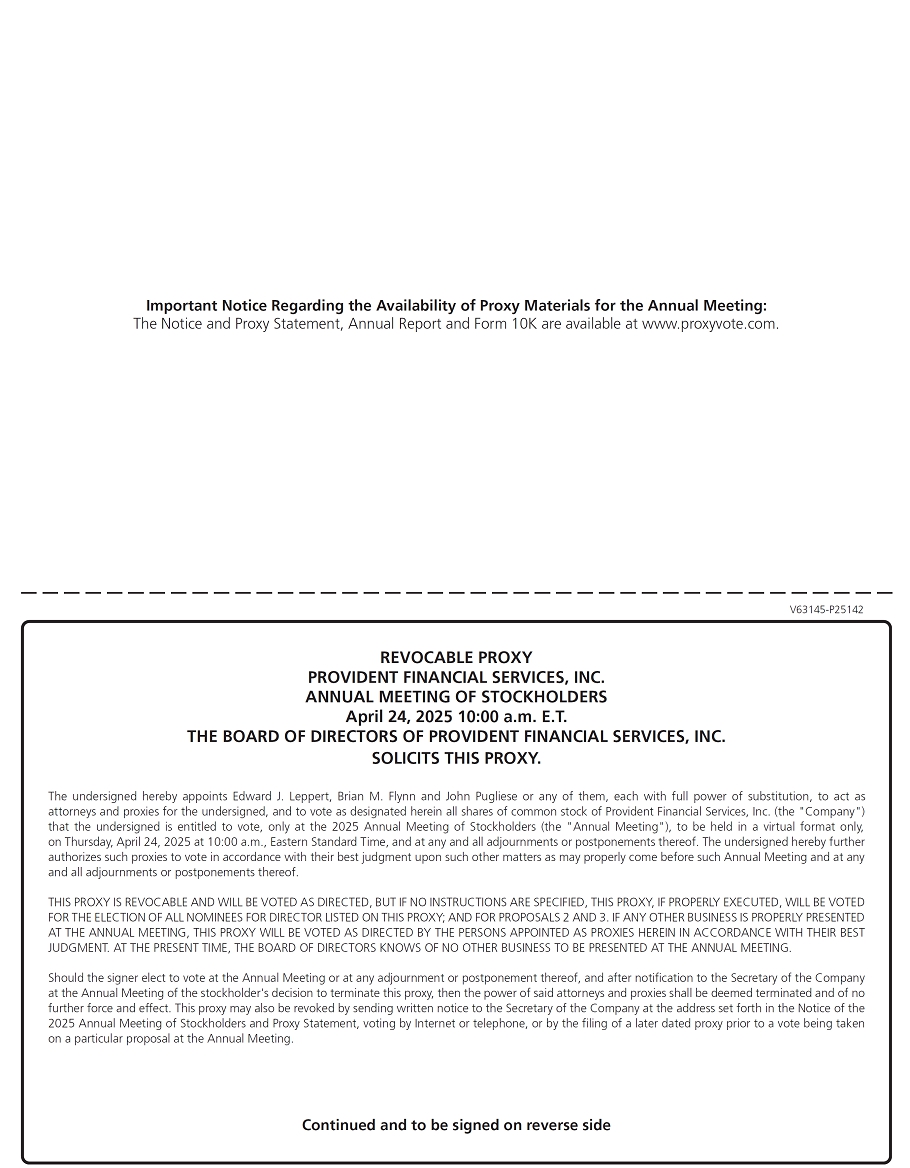 Important Notice Regarding the Availability of Proxy Materials for the Annual Meeting:The Notice and Proxy Statement, Annual Report and Form 10K are available at www.proxyvote.com. V63145-P25142 REVOCABLE PROXY PROVIDENT FINANCIAL SERVICES, INC. ANNUAL MEETING OF STOCKHOLDERS April 24, 2025 10:00 a.m. E.T. THE BOARD OF DIRECTORS OF PROVIDENT FINANCIAL SERVICES, INC. SOLICITS THIS PROXY. The undersigned hereby appoints Edward J. Leppert, Brian M. Flynn and John Pugliese or any of them, each with full power of substitution, to act as attorneys and proxies for the undersigned, and to vote as designated herein all shares of common stock of Provident Financial Services, Inc. (the “Company”) that the undersigned is entitled to vote, only at the 2025 Annual Meeting of Stockholders (the “Annual Meeting”), to be held in a virtual format only,on Thursday, April 24, 2025 at 10:00 a.m., Eastern Standard Time, and at any and all adjournments or postponements thereof. The undersigned hereby further authorizes such proxies to vote in accordance with their best judgment upon such other matters as may properly come before such Annual Meeting and at any and all adjournments or postponements thereof. THIS PROXY IS REVOCABLE AND WILL BE VOTED AS DIRECTED, BUT IF NO INSTRUCTIONS ARE SPECIFIED, THIS PROXY, IF PROPERLY EXECUTED, WILL BE VOTED FOR THE ELECTION OF ALL NOMINEES FOR DIRECTOR LISTED ON THIS PROXY; AND FOR PROPOSALS 2 AND 3. IF ANY OTHER BUSINESS IS PROPERLY PRESENTED AT THE ANNUAL MEETING, THIS PROXY WILL BE VOTED AS DIRECTED BY THE PERSONS APPOINTED AS PROXIES HEREIN IN ACCORDANCE WITH THEIR BEST JUDGMENT. AT THE PRESENT TIME, THE BOARD OF DIRECTORS KNOWS OF NO OTHER BUSINESS TO BE PRESENTED AT THE ANNUAL MEETING. Should the signer elect to vote at the Annual Meeting or at any adjournment or postponement thereof, and after notification to the Secretary of the Company at the Annual Meeting of the stockholder’s decision to terminate this proxy, then the power of said attorneys and proxies shall be deemed terminated and of no further force and effect. This proxy may also be revoked by sending written notice to the Secretary of the Company at the address set forth in the Notice of the 2025 Annual Meeting of Stockholders and Proxy Statement, voting by Internet or telephone, or by the filing of a later dated proxy prior to a vote being taken on a particular proposal at the Annual Meeting. Continued and to be signed on reverse side