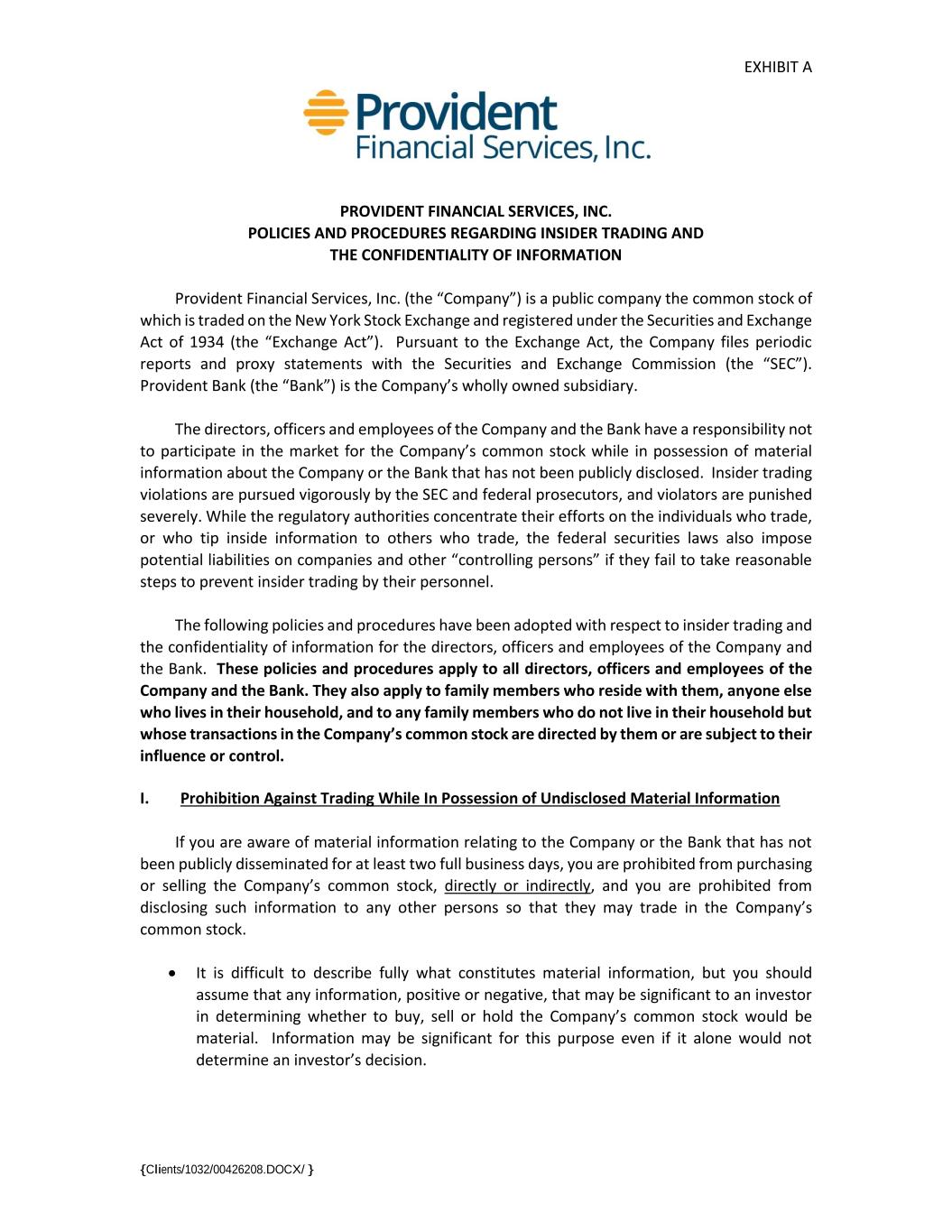 EXHIBIT A {Clients/1032/00426208.DOCX/ } PROVIDENT FINANCIAL SERVICES, INC. POLICIES AND PROCEDURES REGARDING INSIDER TRADING AND THE CONFIDENTIALITY OF INFORMATION Provident Financial Services, Inc. (the “Company”) is a public company the common stock of which is traded on the New York Stock Exchange and registered under the Securities and Exchange Act of 1934 (the “Exchange Act”). Pursuant to the Exchange Act, the Company files periodic reports and proxy statements with the Securities and Exchange Commission (the “SEC”). Provident Bank (the “Bank”) is the Company’s wholly owned subsidiary. The directors, officers and employees of the Company and the Bank have a responsibility not to participate in the market for the Company’s common stock while in possession of material information about the Company or the Bank that has not been publicly disclosed. Insider trading violations are pursued vigorously by the SEC and federal prosecutors, and violators are punished severely. While the regulatory authorities concentrate their efforts on the individuals who trade, or who tip inside information to others who trade, the federal securities laws also impose potential liabilities on companies and other “controlling persons” if they fail to take reasonable steps to prevent insider trading by their personnel. The following policies and procedures have been adopted with respect to insider trading and the confidentiality of information for the directors, officers and employees of the Company and the Bank. These policies and procedures apply to all directors, officers and employees of the Company and the Bank. They also apply to family members who reside with them, anyone else who lives in their household, and to any family members who do not live in their household but whose transactions in the Company’s common stock are directed by them or are subject to their influence or control. I. Prohibition Against Trading While In Possession of Undisclosed Material Information If you are aware of material information relating to the Company or the Bank that has not been publicly disseminated for at least two full business days, you are prohibited from purchasing or selling the Company’s common stock, directly or indirectly, and you are prohibited from disclosing such information to any other persons so that they may trade in the Company’s common stock. • It is difficult to describe fully what constitutes material information, but you should assume that any information, positive or negative, that may be significant to an investor in determining whether to buy, sell or hold the Company’s common stock would be material. Information may be significant for this purpose even if it alone would not determine an investor’s decision.