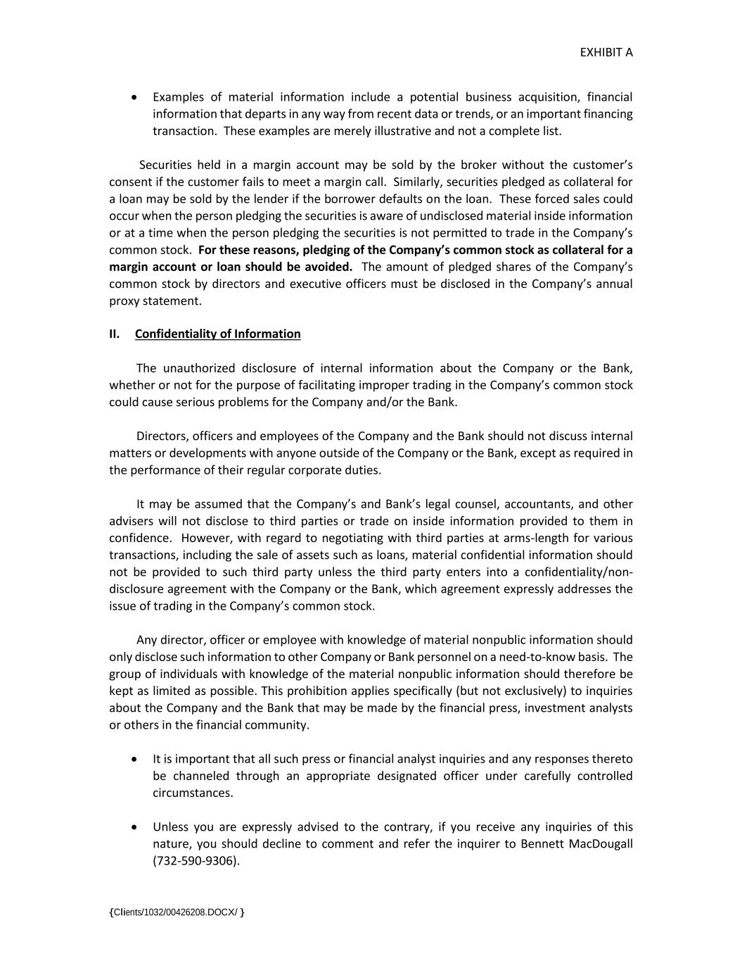 EXHIBIT A {Clients/1032/00426208.DOCX/ } • Examples of material information include a potential business acquisition, financial information that departs in any way from recent data or trends, or an important financing transaction. These examples are merely illustrative and not a complete list. Securities held in a margin account may be sold by the broker without the customer’s consent if the customer fails to meet a margin call. Similarly, securities pledged as collateral for a loan may be sold by the lender if the borrower defaults on the loan. These forced sales could occur when the person pledging the securities is aware of undisclosed material inside information or at a time when the person pledging the securities is not permitted to trade in the Company’s common stock. For these reasons, pledging of the Company’s common stock as collateral for a margin account or loan should be avoided. The amount of pledged shares of the Company’s common stock by directors and executive officers must be disclosed in the Company’s annual proxy statement. II. Confidentiality of Information The unauthorized disclosure of internal information about the Company or the Bank, whether or not for the purpose of facilitating improper trading in the Company’s common stock could cause serious problems for the Company and/or the Bank. Directors, officers and employees of the Company and the Bank should not discuss internal matters or developments with anyone outside of the Company or the Bank, except as required in the performance of their regular corporate duties. It may be assumed that the Company’s and Bank’s legal counsel, accountants, and other advisers will not disclose to third parties or trade on inside information provided to them in confidence. However, with regard to negotiating with third parties at arms-length for various transactions, including the sale of assets such as loans, material confidential information should not be provided to such third party unless the third party enters into a confidentiality/non- disclosure agreement with the Company or the Bank, which agreement expressly addresses the issue of trading in the Company’s common stock. Any director, officer or employee with knowledge of material nonpublic information should only disclose such information to other Company or Bank personnel on a need-to-know basis. The group of individuals with knowledge of the material nonpublic information should therefore be kept as limited as possible. This prohibition applies specifically (but not exclusively) to inquiries about the Company and the Bank that may be made by the financial press, investment analysts or others in the financial community. • It is important that all such press or financial analyst inquiries and any responses thereto be channeled through an appropriate designated officer under carefully controlled circumstances. • Unless you are expressly advised to the contrary, if you receive any inquiries of this nature, you should decline to comment and refer the inquirer to Bennett MacDougall (732-590-9306).