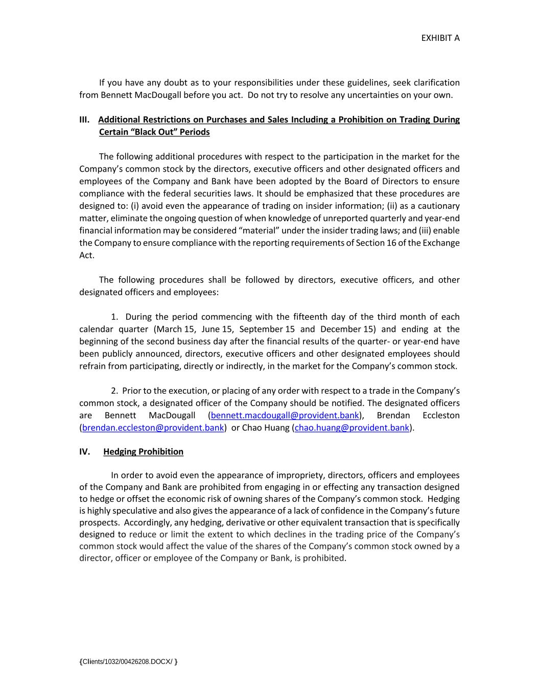 EXHIBIT A {Clients/1032/00426208.DOCX/ } If you have any doubt as to your responsibilities under these guidelines, seek clarification from Bennett MacDougall before you act. Do not try to resolve any uncertainties on your own. III. Additional Restrictions on Purchases and Sales Including a Prohibition on Trading During Certain “Black Out” Periods The following additional procedures with respect to the participation in the market for the Company’s common stock by the directors, executive officers and other designated officers and employees of the Company and Bank have been adopted by the Board of Directors to ensure compliance with the federal securities laws. It should be emphasized that these procedures are designed to: (i) avoid even the appearance of trading on insider information; (ii) as a cautionary matter, eliminate the ongoing question of when knowledge of unreported quarterly and year-end financial information may be considered “material” under the insider trading laws; and (iii) enable the Company to ensure compliance with the reporting requirements of Section 16 of the Exchange Act. The following procedures shall be followed by directors, executive officers, and other designated officers and employees: 1. During the period commencing with the fifteenth day of the third month of each calendar quarter (March 15, June 15, September 15 and December 15) and ending at the beginning of the second business day after the financial results of the quarter- or year-end have been publicly announced, directors, executive officers and other designated employees should refrain from participating, directly or indirectly, in the market for the Company’s common stock. 2. Prior to the execution, or placing of any order with respect to a trade in the Company’s common stock, a designated officer of the Company should be notified. The designated officers are Bennett MacDougall (bennett.macdougall@provident.bank), Brendan Eccleston (brendan.eccleston@provident.bank) or Chao Huang (chao.huang@provident.bank). IV. Hedging Prohibition In order to avoid even the appearance of impropriety, directors, officers and employees of the Company and Bank are prohibited from engaging in or effecting any transaction designed to hedge or offset the economic risk of owning shares of the Company’s common stock. Hedging is highly speculative and also gives the appearance of a lack of confidence in the Company’s future prospects. Accordingly, any hedging, derivative or other equivalent transaction that is specifically designed to reduce or limit the extent to which declines in the trading price of the Company’s common stock would affect the value of the shares of the Company’s common stock owned by a director, officer or employee of the Company or Bank, is prohibited.