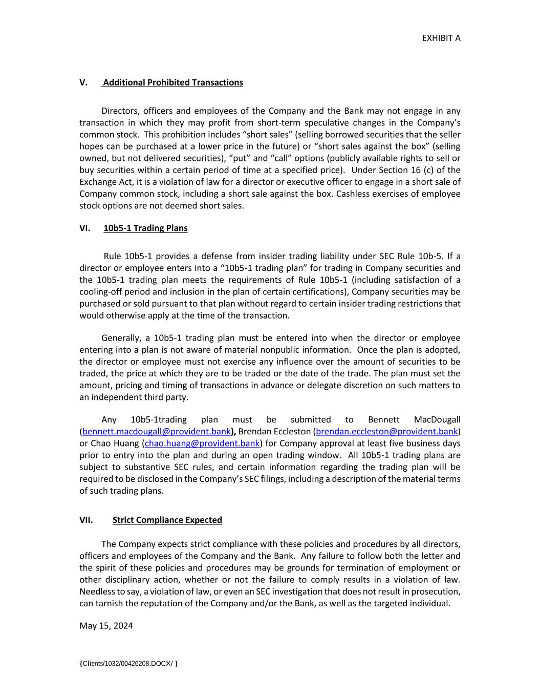 EXHIBIT A {Clients/1032/00426208.DOCX/ } V. Additional Prohibited Transactions Directors, officers and employees of the Company and the Bank may not engage in any transaction in which they may profit from short-term speculative changes in the Company’s common stock. This prohibition includes “short sales” (selling borrowed securities that the seller hopes can be purchased at a lower price in the future) or “short sales against the box” (selling owned, but not delivered securities), “put” and “call” options (publicly available rights to sell or buy securities within a certain period of time at a specified price). Under Section 16 (c) of the Exchange Act, it is a violation of law for a director or executive officer to engage in a short sale of Company common stock, including a short sale against the box. Cashless exercises of employee stock options are not deemed short sales. VI. 10b5-1 Trading Plans Rule 10b5-1 provides a defense from insider trading liability under SEC Rule 10b-5. If a director or employee enters into a “10b5-1 trading plan” for trading in Company securities and the 10b5-1 trading plan meets the requirements of Rule 10b5-1 (including satisfaction of a cooling-off period and inclusion in the plan of certain certifications), Company securities may be purchased or sold pursuant to that plan without regard to certain insider trading restrictions that would otherwise apply at the time of the transaction. Generally, a 10b5-1 trading plan must be entered into when the director or employee entering into a plan is not aware of material nonpublic information. Once the plan is adopted, the director or employee must not exercise any influence over the amount of securities to be traded, the price at which they are to be traded or the date of the trade. The plan must set the amount, pricing and timing of transactions in advance or delegate discretion on such matters to an independent third party. Any 10b5-1trading plan must be submitted to Bennett MacDougall (bennett.macdougall@provident.bank), Brendan Eccleston (brendan.eccleston@provident.bank) or Chao Huang (chao.huang@provident.bank) for Company approval at least five business days prior to entry into the plan and during an open trading window. All 10b5-1 trading plans are subject to substantive SEC rules, and certain information regarding the trading plan will be required to be disclosed in the Company’s SEC filings, including a description of the material terms of such trading plans. VII. Strict Compliance Expected The Company expects strict compliance with these policies and procedures by all directors, officers and employees of the Company and the Bank. Any failure to follow both the letter and the spirit of these policies and procedures may be grounds for termination of employment or other disciplinary action, whether or not the failure to comply results in a violation of law. Needless to say, a violation of law, or even an SEC investigation that does not result in prosecution, can tarnish the reputation of the Company and/or the Bank, as well as the targeted individual. May 15, 2024