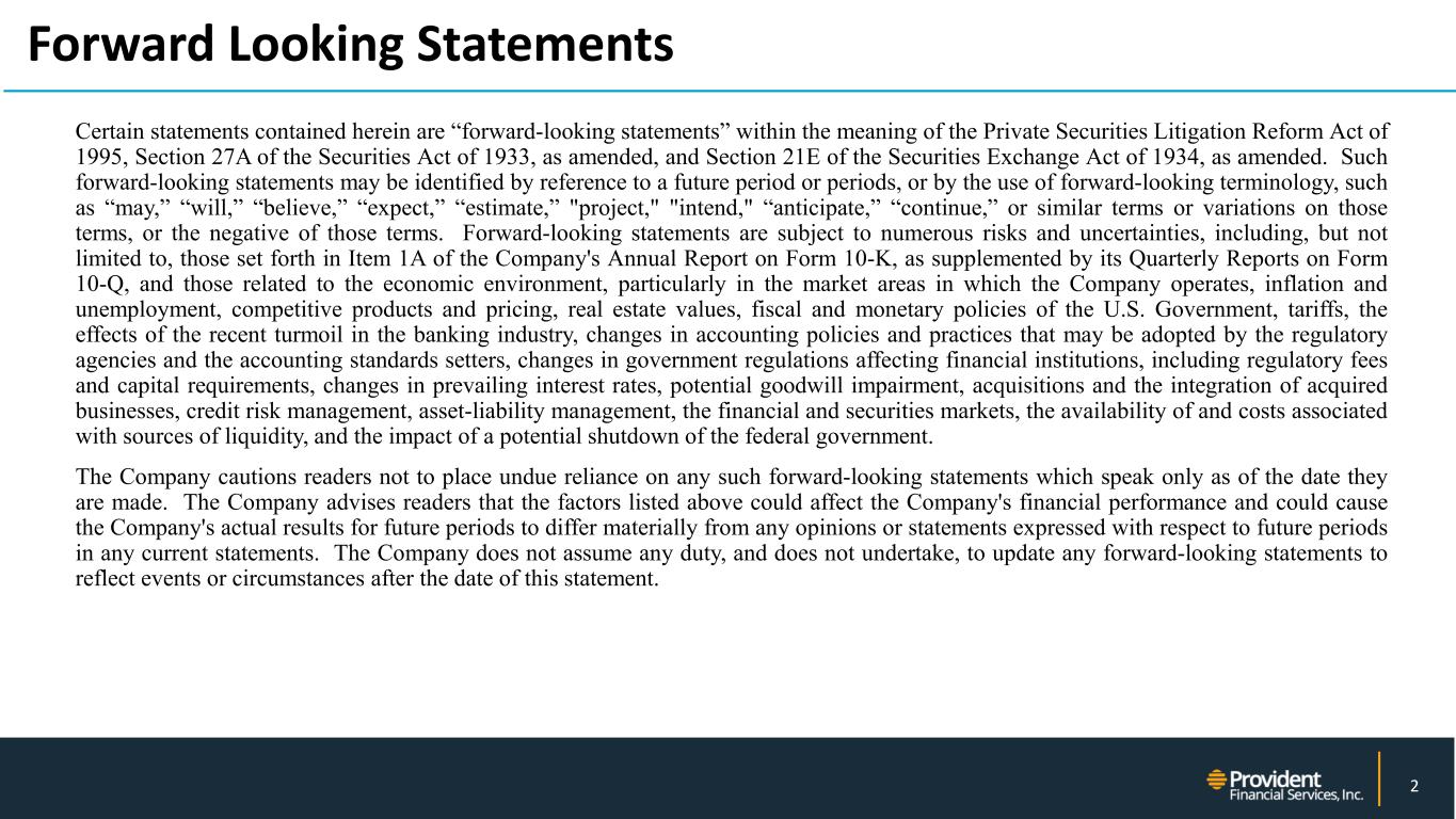 NYSE: PFS Forward Looking Statements Certain statements contained herein are “forward-looking statements” within the meaning of the Private Securities Litigation Reform Act of 1995, Section 27A of the Securities Act of 1933, as amended, and Section 21E of the Securities Exchange Act of 1934, as amended. Such forward-looking statements may be identified by reference to a future period or periods, or by the use of forward-looking terminology, such as “may,” “will,” “believe,” “expect,” “estimate,” "project," "intend," “anticipate,” “continue,” or similar terms or variations on those terms, or the negative of those terms. Forward-looking statements are subject to numerous risks and uncertainties, including, but not limited to, those set forth in Item 1A of the Company's Annual Report on Form 10-K, as supplemented by its Quarterly Reports on Form 10-Q, and those related to the economic environment, particularly in the market areas in which the Company operates, inflation and unemployment, competitive products and pricing, real estate values, fiscal and monetary policies of the U.S. Government, tariffs, the effects of the recent turmoil in the banking industry, changes in accounting policies and practices that may be adopted by the regulatory agencies and the accounting standards setters, changes in government regulations affecting financial institutions, including regulatory fees and capital requirements, changes in prevailing interest rates, potential goodwill impairment, acquisitions and the integration of acquired businesses, credit risk management, asset-liability management, the financial and securities markets, the availability of and costs associated with sources of liquidity, and the impact of a potential shutdown of the federal government. The Company cautions readers not to place undue reliance on any such forward-looking statements which speak only as of the date they are made. The Company advises readers that the factors listed above could affect the Company's financial performance and could cause the Company's actual results for future periods to differ materially from any opinions or statements expressed with respect to future periods in any current statements. The Company does not assume any duty, and does not undertake, to update any forward-looking statements to reflect events or circumstances after the date of this statement. 2