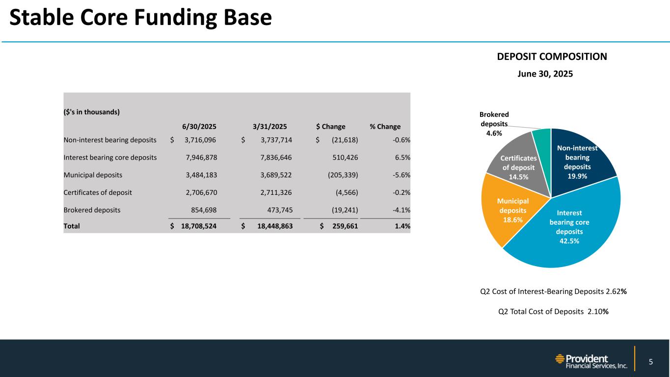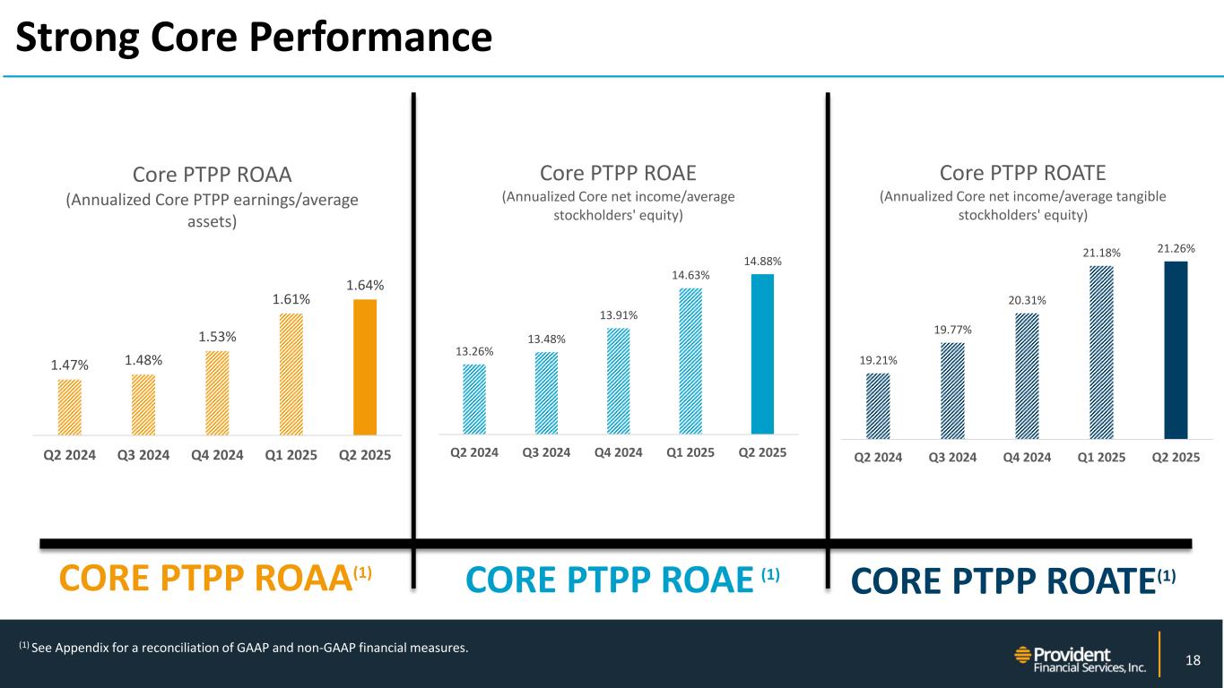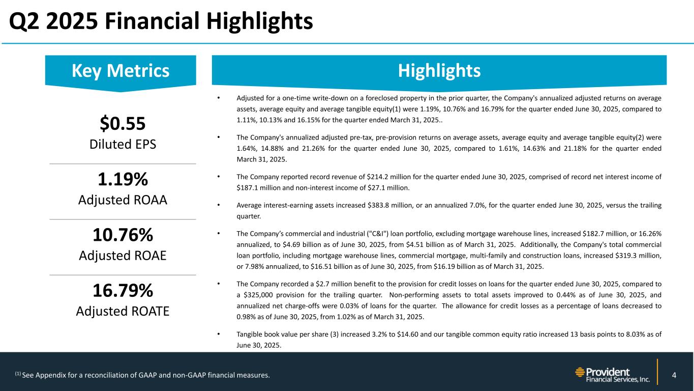 NYSE: PFS 4 Q2 2025 Financial Highlights $0.55 Diluted EPS 1.19% Adjusted ROAA 10.76% Adjusted ROAE 16.79% Adjusted ROATE Key Metrics Highlights • Adjusted for a one-time write-down on a foreclosed property in the prior quarter, the Company's annualized adjusted returns on average assets, average equity and average tangible equity(1) were 1.19%, 10.76% and 16.79% for the quarter ended June 30, 2025, compared to 1.11%, 10.13% and 16.15% for the quarter ended March 31, 2025.. • The Company's annualized adjusted pre-tax, pre-provision returns on average assets, average equity and average tangible equity(2) were 1.64%, 14.88% and 21.26% for the quarter ended June 30, 2025, compared to 1.61%, 14.63% and 21.18% for the quarter ended March 31, 2025. • The Company reported record revenue of $214.2 million for the quarter ended June 30, 2025, comprised of record net interest income of $187.1 million and non-interest income of $27.1 million. • Average interest-earning assets increased $383.8 million, or an annualized 7.0%, for the quarter ended June 30, 2025, versus the trailing quarter. • The Company’s commercial and industrial ("C&I") loan portfolio, excluding mortgage warehouse lines, increased $182.7 million, or 16.26% annualized, to $4.69 billion as of June 30, 2025, from $4.51 billion as of March 31, 2025. Additionally, the Company's total commercial loan portfolio, including mortgage warehouse lines, commercial mortgage, multi-family and construction loans, increased $319.3 million, or 7.98% annualized, to $16.51 billion as of June 30, 2025, from $16.19 billion as of March 31, 2025. • The Company recorded a $2.7 million benefit to the provision for credit losses on loans for the quarter ended June 30, 2025, compared to a $325,000 provision for the trailing quarter. Non-performing assets to total assets improved to 0.44% as of June 30, 2025, and annualized net charge-offs were 0.03% of loans for the quarter. The allowance for credit losses as a percentage of loans decreased to 0.98% as of June 30, 2025, from 1.02% as of March 31, 2025. • Tangible book value per share (3) increased 3.2% to $14.60 and our tangible common equity ratio increased 13 basis points to 8.03% as of June 30, 2025. (1) See Appendix for a reconciliation of GAAP and non-GAAP financial measures.