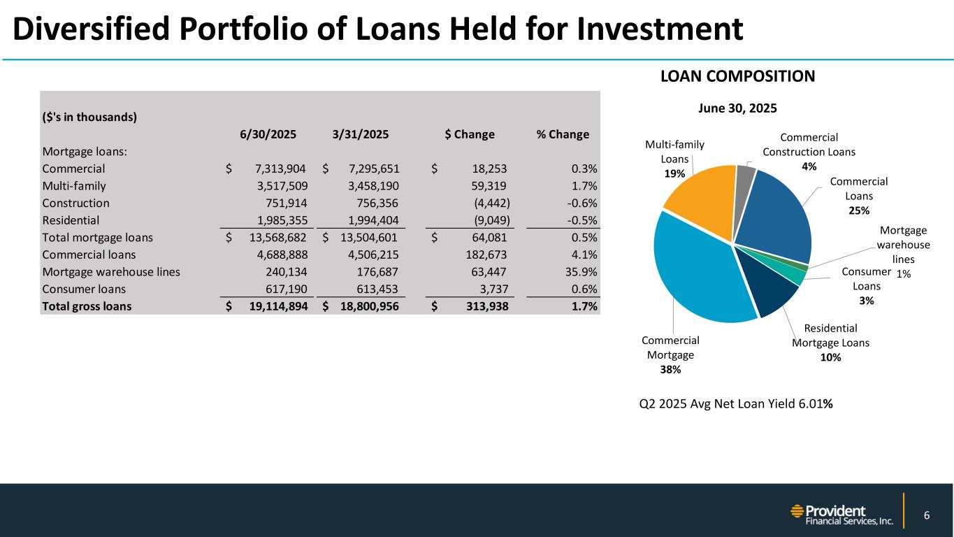 NYSE: PFS Stable Core Funding Base DEPOSIT COMPOSITION 5 Non-interest bearing deposits 19.9% Interest bearing core deposits 42.5% Municipal deposits 18.6% Certificates of deposit 14.5% Brokered deposits 4.6% June 30, 2025 Q2 Cost of Interest-Bearing Deposits 2.62% Q2 Total Cost of Deposits 2.10% ($'s in thousands) 6/30/2025 3/31/2025 $ Change % Change Non-interest bearing deposits $ 3,716,096 $ 3,737,714 $ (21,618) -0.6% Interest bearing core deposits 7,946,878 7,836,646 510,426 6.5% Municipal deposits 3,484,183 3,689,522 (205,339) -5.6% Certificates of deposit 2,706,670 2,711,326 (4,566) -0.2% Brokered deposits 854,698 473,745 (19,241) -4.1% Total $ 18,708,524 $ 18,448,863 $ 259,661 1.4%