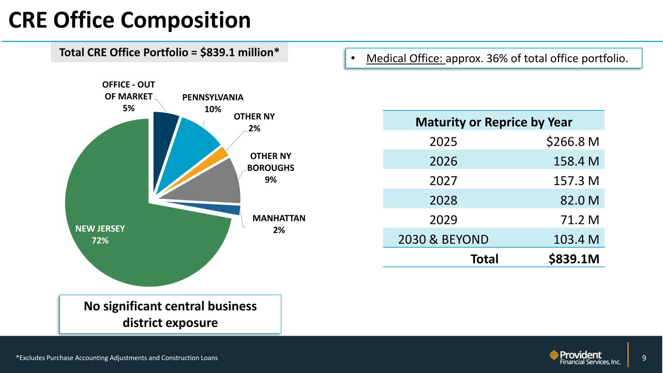 NYSE: PFS Multi-family Composition (NY and Rent Stabilized sectors) 8 OTHER NY BOROUGHS 48% OTHER NY 43% MANHATTAN 9% Total NY Multi-family Loans = $479.7 Million Total multi-family loan portfolio: $3.57 Billion • Of the total, 91 Loans on multi-family properties in the five boroughs of NYC, aggregate outstanding $270.1 million, with an average loan size of $2.9 million. Rent stabilized loan portfolio: <0.66% of total loan portfolio • All performing • Largest loan: $41.3 million with 63% LTV and 1.38x DSCR Multi-family balances by origination Year: • NY 2025 loans: $27.9 MM • NY 2024 loans: $36.8 MM • NY 2023 loans: $97.4 MM • NY 2022 loans: $124.1 MM • NY 2021 and prior loans: $208.2 MM • All Multi-family 2025 loans: $138.1 MM • All Multi-family 2024 loans: $265.2 MM • All Multi-family 2023 loans: $414.2 MM • All Multi-family 2022 loans: $637.8 MM • All Multi-family 2021 and prior loans: $2.11 B *Excludes Purchase Accounting Adjustments and Construction Loans